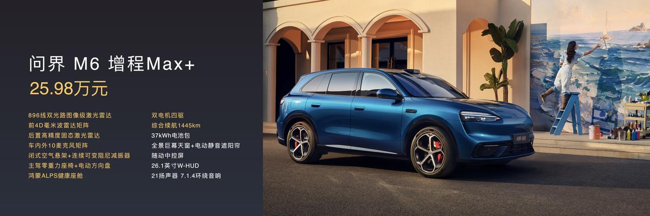 2026年的新能源SUV市场,似乎被问界M6这匹黑马搅动了风云。截至4月17日,预售小订已突破10万台,这个数字本身就是对产品力最硬核的背书。今日,这款车正式上市,其“入门即MAX+、标配即满配”的策略更是直击行业痛点。 在这个同级车型往往需要加价数万元才能选装高阶配置的当下,问界M6选择了一条更真诚的路。它没有把用户当“韭菜”,而是直接把顶格配置打入了基础版。 无论是智驾维度的华为乾崑智驾ADS4.1高阶版配合896线双光路图像级激光雷达,还是底盘上的华为途灵平台与闭式空气悬架,这种毫不保留的堆料,让25万级SUV的价值基准线被彻底抬高。 再加上全景巨幕天窗、21扬声器7.1.4环绕音响以及83.62%高强钢车身的安全保障,每一分钱都花在了刀刃上。结合25.98万元的售价与上市权益后,这套“无套路”的高价值组合拳,无疑将会成为主流家庭用户闭眼入的首选。 问界M6起售价25.98万元 余承东点赞问界M6静谧性超百万豪车