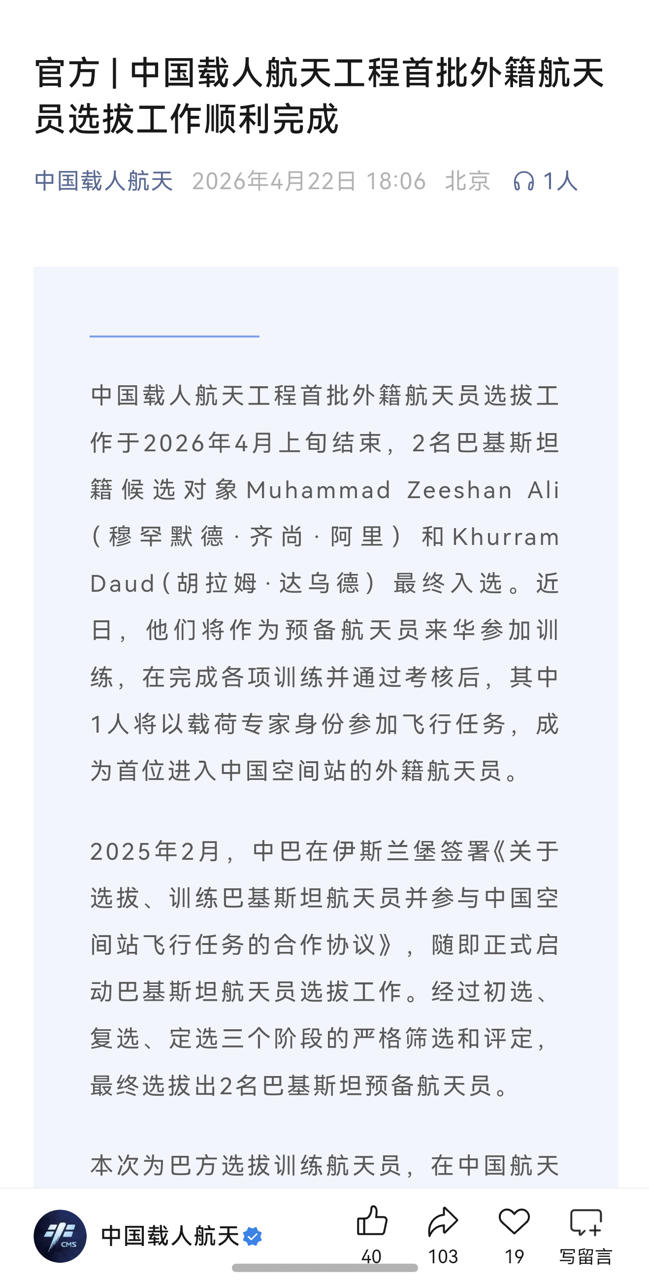 巴铁来了!【航天 官方消息 | 中国载人航天工程首批外籍航天员选拔工作顺利完成】中国载人航天工程首批外籍航天员选拔工作于2026年4月上旬结束,2名巴基斯坦籍候选对象Muhammad Zeeshan Ali(穆罕默德·齐尚·阿里)和Khurram Daud(胡拉姆·达乌德)最终入选。近日,他们将作为预备航天员来华参加训练,在完成各项训练并通过考核后,其中1人将以载荷专家身份参加飞行任务,成为首位进入中国空间站的外籍航天员。