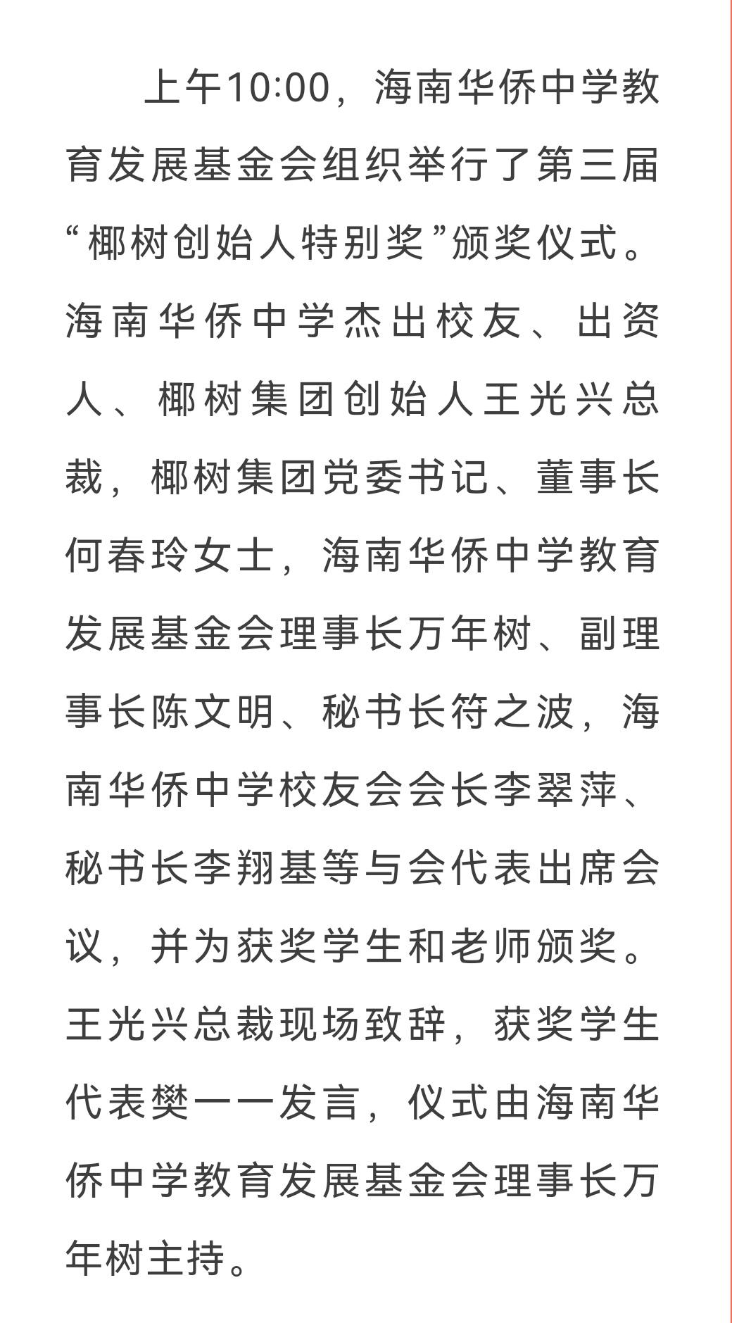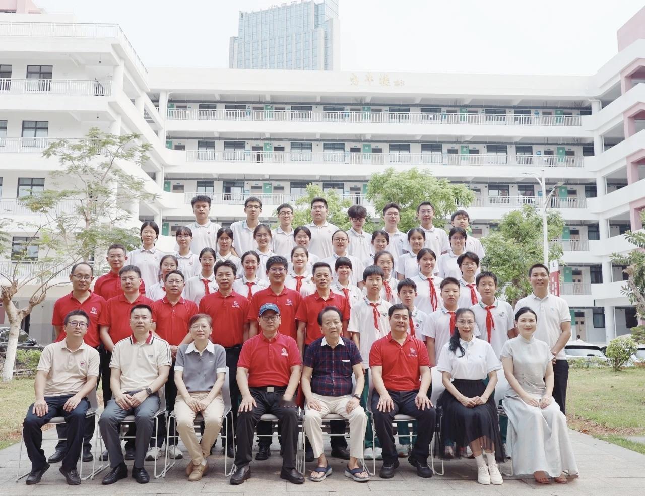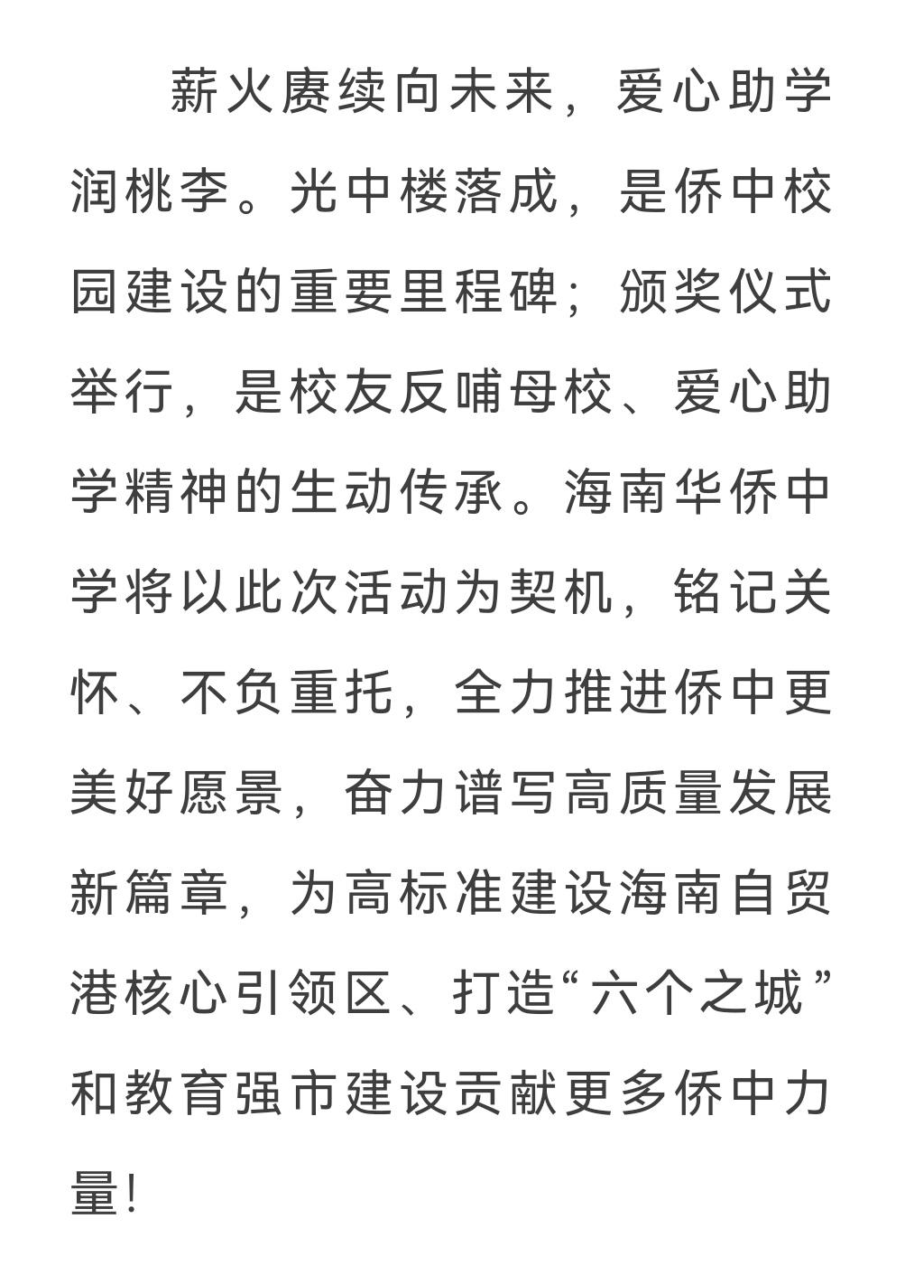 海南华侨中学光中楼揭幕仪式 4月19日举行,椰树集团创始人王光兴总裁,椰树集团党委书记、董事长何春玲女士,海南华侨中学教育发展基金会理事长万年树女士,校友会会长李翠萍,学校党委书记杨云义,校长张伟共同为“光中楼”楼牌揭幕。