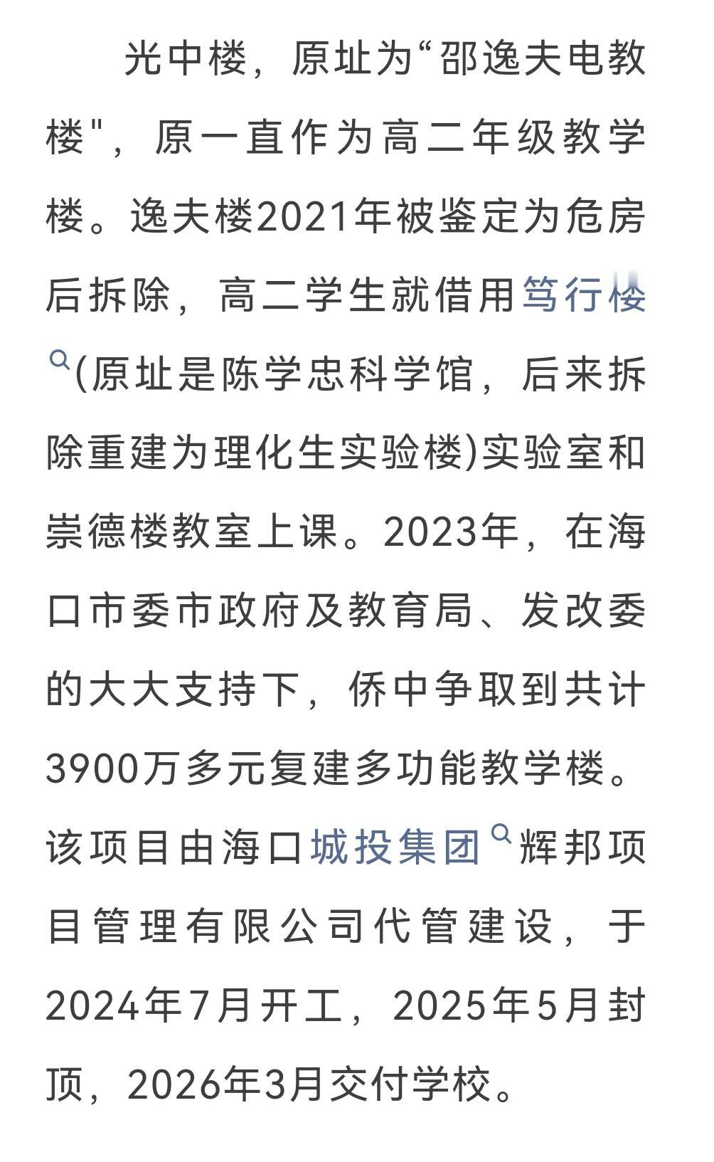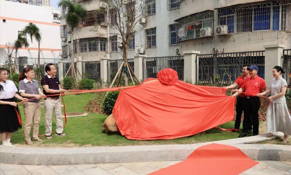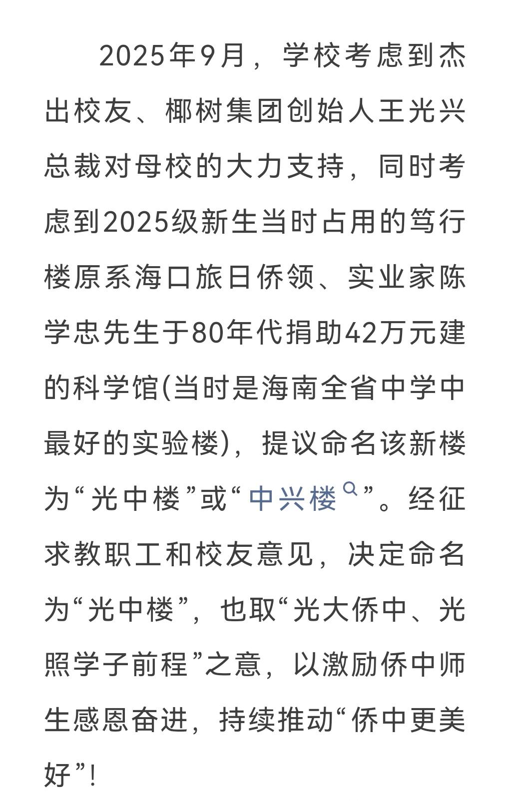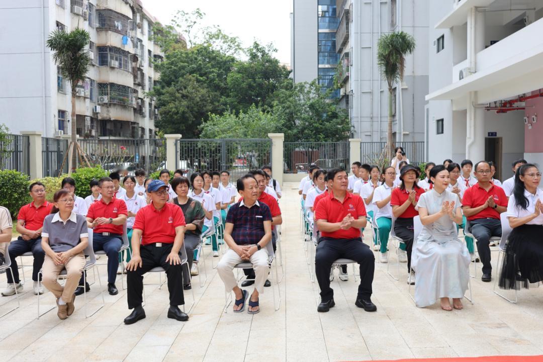 海南华侨中学光中楼揭幕仪式 4月19日举行,椰树集团创始人王光兴总裁,椰树集团党委书记、董事长何春玲女士,海南华侨中学教育发展基金会理事长万年树女士,校友会会长李翠萍,学校党委书记杨云义,校长张伟共同为“光中楼”楼牌揭幕。