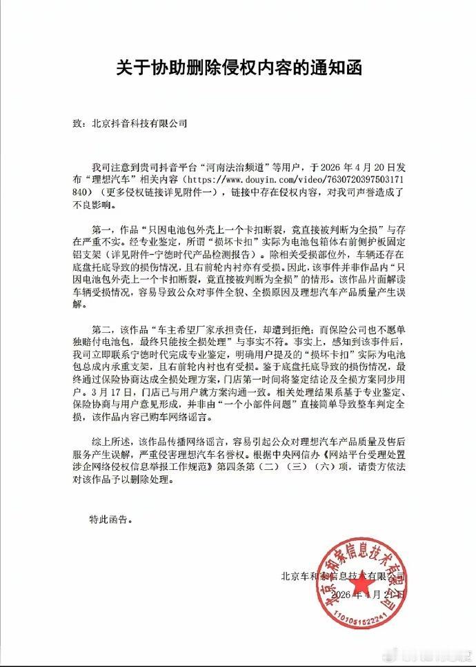 一个卡扣引发的误会,该说清楚了 前阵子那个“卡扣断裂就判全损”的视频,估计不少人刷到过。当时我也觉得离谱,一个卡扣而已至于吗? 现在理想官方的函件出来了,把事情说清楚了。那个所谓的“卡扣”,经宁德时代鉴定,实际是电池包承重铝支架,不是外壳上的小零件。而且车子底盘托底了、右前轮内衬也伤了,不是单一问题。全损是综合这些损伤、经保险协商后定的方案,3月17日已经跟车主达成一致了。 说白了,视频把一件复杂的事简化成了“一个卡扣引发的悲剧”,看着有戏剧性,但跟事实差得有点远。网上的东西还是得让子弹飞一会儿,别急着站队。【来自懂车帝车友圈】