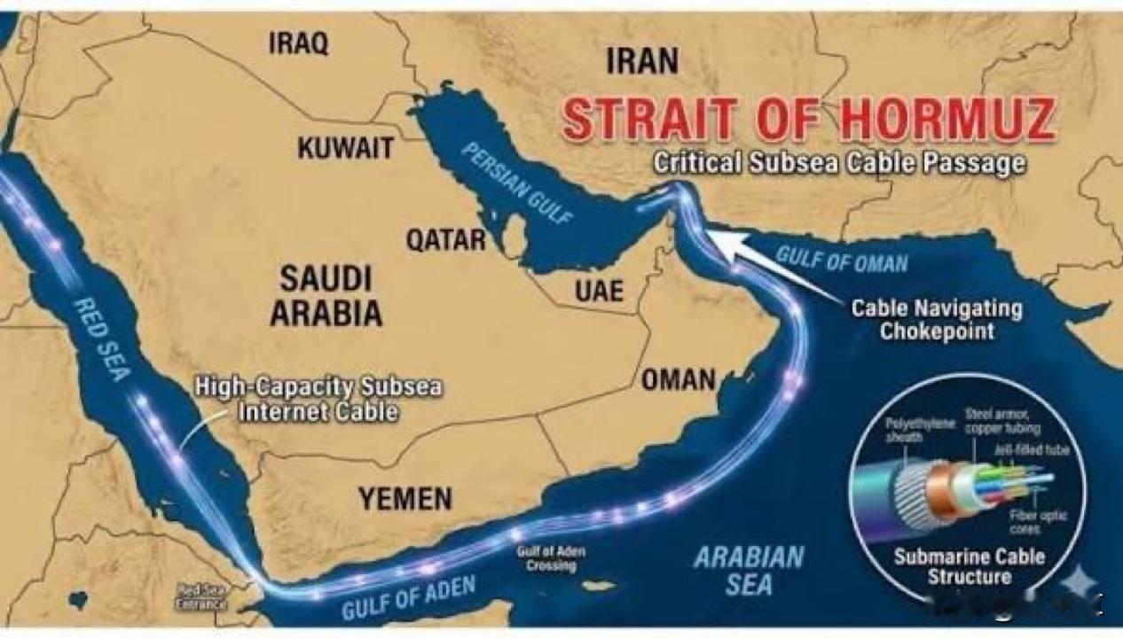 伊朗又亮出一底牌! 伊朗刚刚发布了一张详细地图,显示了穿过霍尔木兹海峡的海底互联网电缆,并称其为:高度脆弱。 可以确定的是,至少有七条主要海底电缆穿过这个狭窄的咽喉要道。 阿联酋、卡塔尔、巴林、科威特和沙特阿拉伯等南部海湾国家对这些线路的依赖程度远超伊朗。 它们的云枢纽和数据中心就位于同一片水域的另一侧,暴露在外。 一旦切断,这些国家的国际带宽将瞬间下降 60% 到 80% 以上。 迪拜和多哈等金融中心高度依赖低延迟的跨境结算。电缆中断会导致银行交易延迟、股市波动,甚至本地云计算服务(如 AWS 或 Azure 在该区域的数据中心)出现大规模故障。 这对该区域经济堪称毁灭级。 特朗普不断声称伊朗“崩溃”且不断加大威胁,现在伊朗只公布了一张地图,就精准地显示了下一个痛点所在。