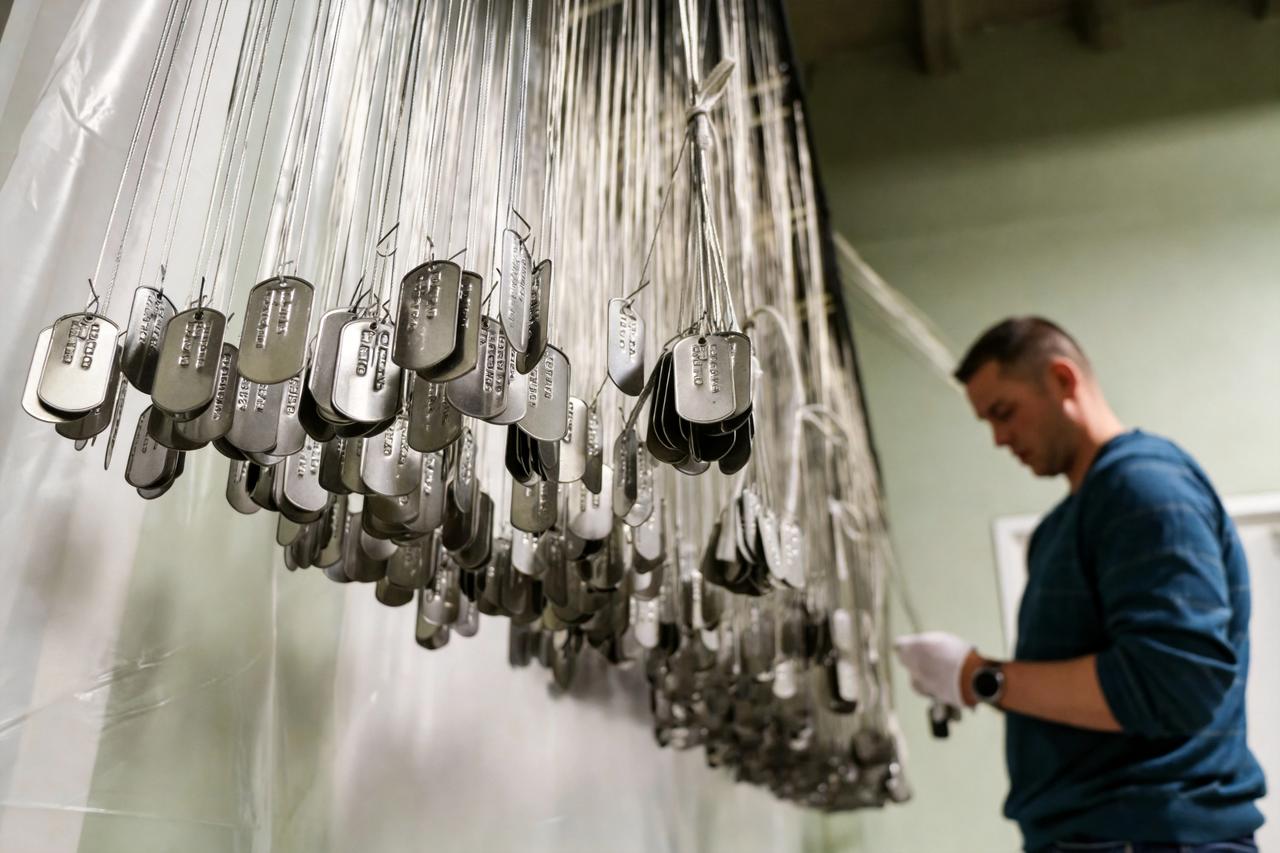 这是美国一座国家退伍军人艺术博物馆里挂着的“狗牌”。这里共收藏了58000枚“狗牌”。每一块“狗牌”上都刻着其代表的阵亡的美军姓名、出生年月与死亡日期。 美国“狗牌”始于1906年,直到1916年全军才开始标配。每名士兵有两枚。如果士兵阵亡后,一枚将随遗体安葬,而另一枚则由部队收回登记,退役时一枚上交,而另一枚留作纪念。 “狗牌”之名源自其形状,因外形酷似宠物的项圈铭牌,所以被美军士兵自嘲为“狗牌”。一枚小小的“狗牌”看似作用不大,但对于士兵来说非常重要。在他们生前,他们像宝贝一样珍藏着它们。当美军士兵阵亡后,一枚“狗牌”胜似任何遗言。