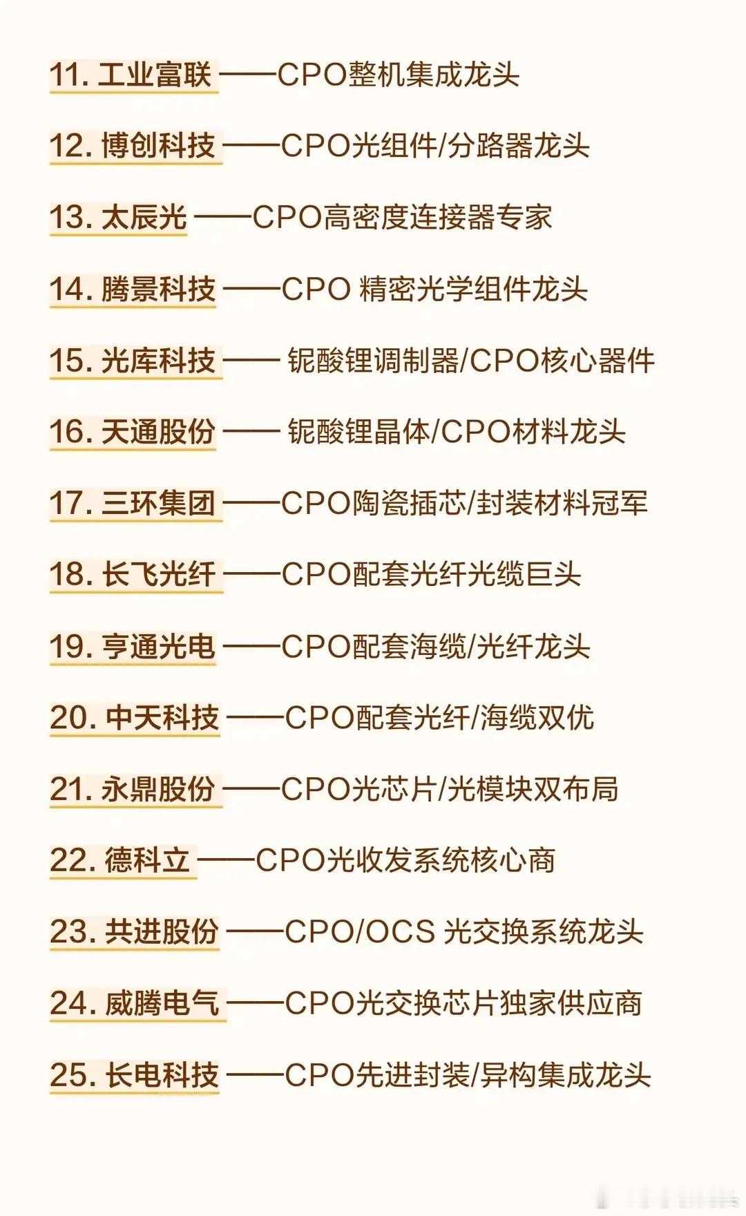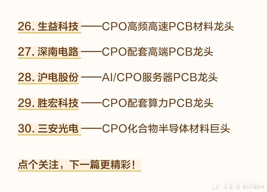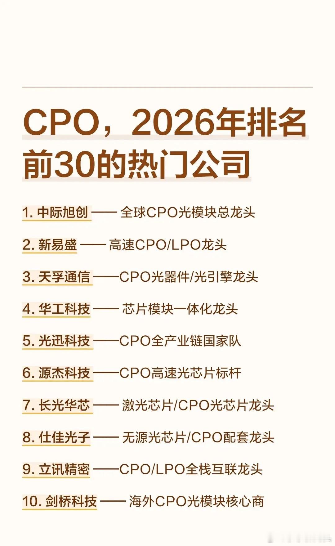 CPO,2026年排名前30的热门公司,绝对的业绩龙头!业务都排到28年去了?1. 中际旭创 —— 全球 CPO 光模块总龙头2. 新易盛 —— 高速 CPO/LPO 龙头3. 天孚通信 ——CPO 光器件 / 光引擎龙头4. 华工科技 —— 芯片模块一体化龙头5. 光迅科技 ——CPO 全产业链国家队6. 源杰科技 ——CPO 高速光芯片标杆7. 长光华芯 —— 激光芯片 / CPO 光芯片龙头8. 仕佳光子 —— 无源光芯片 / CPO 配套龙头9. 立讯精密 ——CPO/LPO 全栈互联龙头10. 剑桥科技 —— 海外 CPO 光模块核心商11. 工业富联 ——CPO 整机集成龙头12. 博创科技 ——CPO 光组件 / 分路器龙头13. 太辰光 ——CPO 高密度连接器专家14. 腾景科技 ——CPO 精密光学组件龙头15. 光库科技 —— 铌酸锂调制器 / CPO 核心器件16. 天通股份 —— 铌酸锂晶体 / CPO 材料龙头17. 三环集团 ——CPO 陶瓷插芯 / 封装材料冠军18. 长飞光纤 ——CPO 配套光纤光缆巨头19. 亨通光电 ——CPO 配套海缆 / 光纤龙头20. 中天科技 ——CPO 配套光纤 / 海缆双优21. 永鼎股份 ——CPO 光芯片 / 光模块双布局22. 德科立 ——CPO 光收发系统核心商23. 共进股份 ——CPO/OCS 光交换系统龙头24. 威腾电气 ——CPO 光交换芯片独家供应商25. 长电科技 ——CPO 先进封装 / 异构集成龙头26. 生益科技 ——CPO 高频高速 PCB 材料龙头27. 深南电路 ——CPO 配套高端 PCB 龙头28. 沪电股份 ——AI/CPO 服务器 PCB 龙头29. 胜宏科技 ——CPO 配套算力 PCB 龙头30. 三安光电 ——CPO 化合物半导体材料巨头
