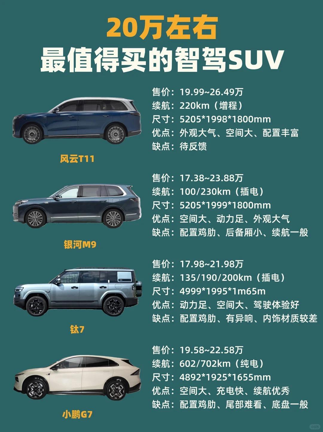 🔥20 万搞定高阶智驾!这 4 款 SUV 闭眼冲 预算 20 万,想要智驾拉满的家用 SUV?通勤、高速、自动泊车全能拿捏!今天盘点风云 T11、银河 M9、钛 7、小鹏 G7 四款高智驾车型,硬核干货,建议收藏! 1️⃣风云 T11:移动安全堡垒 携手 Momenta 联合打造猎鹰 700 高阶智驾,搭载可自主迭代学习的 R6 飞轮大模型,路况感知与决策能力极强,复杂路况处理能力大幅提升。高速 NOA 自动变道超车平顺稳妥;城市道路可从容应对拥堵跟车、无保护左转;狭窄车位也可精准自动泊车,日常通勤安全感拉满。 2️⃣银河 M9:全域无图 AI 王者 硬件搭载 11 摄像头 + 3 毫米波雷达 + 1 颗激光雷达,搭配千里浩瀚 H5 方案,实现全国全域无图 NOA,不依赖高精地图,乡间小路、城市街巷均可从容通行。极限窄位泊车、全场景智能泊车都轻松胜任,AEB 主动制动性能强悍,高速行驶安全防护到位。 3️⃣钛 7:比亚迪技术性能猛兽 全系标配天神之眼 B 智驾系统,顶配搭载激光雷达 + 英伟达 Orin-X 芯片,强悍算力加持,三目摄像头实现全距离路况感知。高速领航可自主进出匝道、智能超车,后续 OTA 可解锁全场景城市智驾,各类车位智能泊入,三电技术过硬,动力性能出色。 4️⃣小鹏 G7:纯电智驾天花板 Ultra 版搭载三颗自研图灵 AI 芯片,算力大幅升级,全域 XNGP 无图智驾覆盖全场景,主动避让、智能行驶十分灵活。搭配 AR-HUD 全景抬头显示,路况信息实时投射。同时 5C 超快充技术强悍,补能速度快,长续航加持,纯电长途出行无续航焦虑。 💡选购总结 偏爱成熟算法、全域智能:选风云 T11、银河 M9 追求硬核动力与底层技术:选钛 7 纯电家用、快充 + 高阶智驾首选:小鹏 G7【来自懂车帝车友圈】