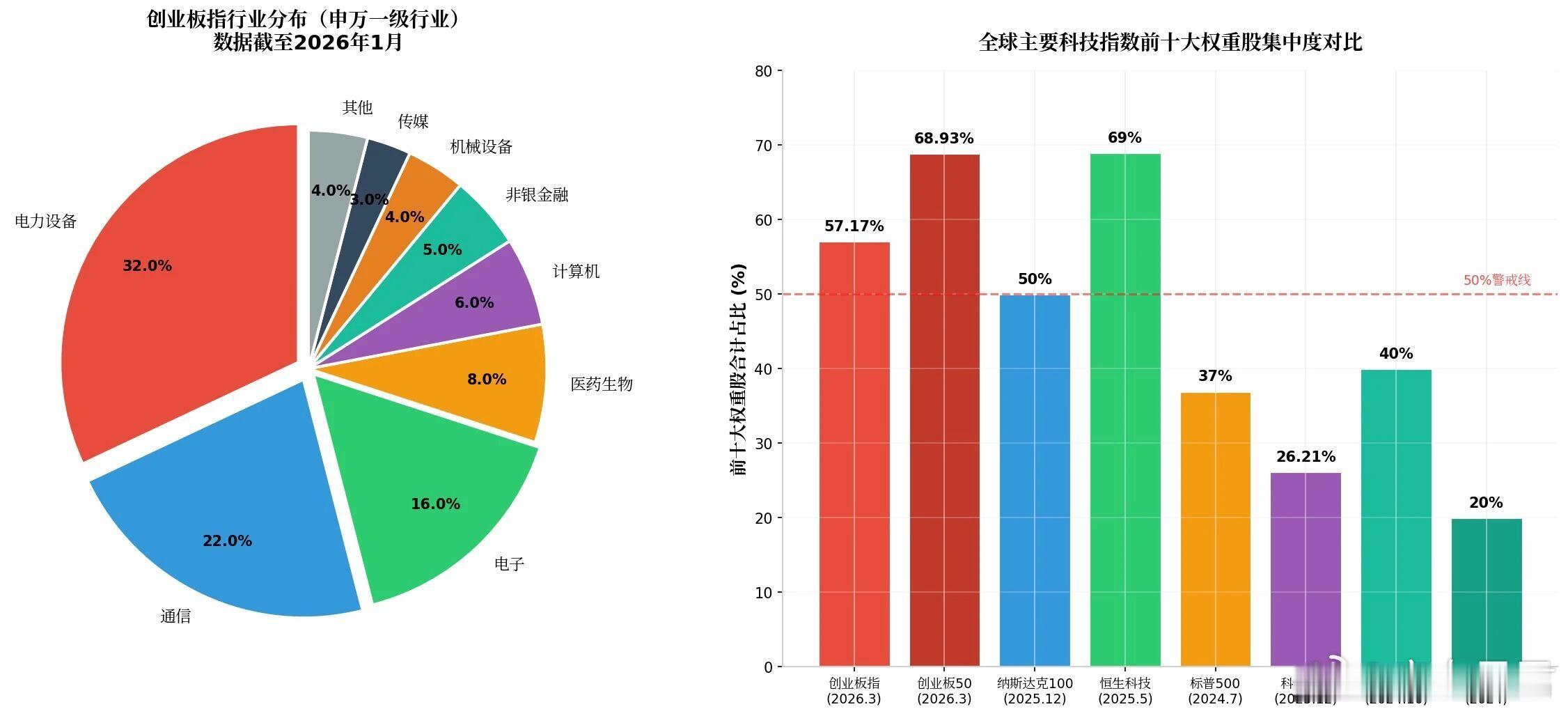 这带来的一个问题就是指数涨了,但很多投个股的没赚钱。这一轮上涨,不是创业板所有公司一起均衡上涨,而是资金高度集中在新能源、AI算力、光模块这些少数方向的龙头公司上。这就导致,创业板创新高,但大概还有一半公司是下跌的。全面牛没有了,结构性行情非常明显。有人会说,美股不也是这样吗?纳斯达克也有七巨头,合计占指数的大约41.2%,集中度一点都不低。创业板指行业分布与全球指数集中度对比(数据来源:Wind、国证指数)最高的时候接近55%,而且是从2020年疫情后那一轮科技股的重估开始,一直延续到现在。但美股的集中,和我们创业板目前的集中,稍有区别。第一,美股的集中是慢慢形成的,我们创业板这一轮集中,来得太快了。从原来百分之十几,在短时间内快速抬升到接近一半。第二,美股那几家龙头,和我们创业板这些龙头,公司的性质也不一样。美国七巨头多数做的是全球生意,市场“腹地”超越了国界。比如英伟达,多数国家很难绕开它。它建立的技术壁垒、生态壁垒,先发优势特别明显。这就导致英伟达不仅有竞争力,还有定价权。这也是支撑纳斯达克高集中度的重要原因之一。