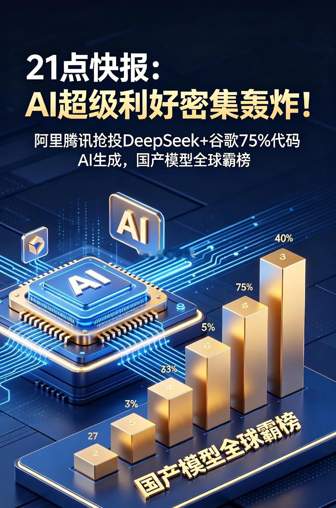 21点快报:AI超级利好密集轰炸!阿里腾讯抢投DeepSeek+谷歌75%代码AI生成,国产模型全球霸榜4月22日晚间,AI领域迎来五连发超级利好,无任何利空消息,全球AI产业格局加速重塑,A股AI算力、大模型、应用生态将迎来史诗级催化,明日核心赛道有望集体爆发 。一、DeepSeek估值超200亿美元,阿里腾讯抢投(超级利好)- 核心内容:腾讯、阿里正洽谈投资AI新锐DeepSeek,公司寻求以超200亿美元估值融资,创国产AI初创企业估值新高 。- 利好板块:大模型、AI基础设施、算力租赁、AI应用- 受益个股:- 直接关联:幻方量化(DeepSeek母公司)、昆仑万维(大模型生态)、科大讯飞(国产大模型龙头)- 算力支撑:寒武纪、海光信息、中科创达、光环新网- 应用场景:金山办公、万兴科技、拓尔思、同花顺二、谷歌AI全面爆发,三大里程碑刷屏(超级利好)1. 代码生成率达75%:谷歌所有新代码中,75%由AI生成,Gemini Enterprise付费月活环比增长40%2. 7.5亿美元智能体基金:谷歌云设立7.5亿美元基金,助力合作伙伴加速智能体AI开发3. 算力需求暴增:谷歌云AI使用量达每分钟160亿Tokens,较上季度增长60%- 利好板块:AI编程、智能体、算力芯片、云服务- 受益个股:- AI编程:润和软件、东方国信、神州数码- 智能体:科大讯飞、云从科技、格灵深瞳- 算力芯片:英伟达、AMD(A股映射:胜宏科技、中芯国际)- 云服务:浪潮信息、紫光股份、宝信软件三、北京大模型备案225款,占全国三成(超级利好)- 核心内容:北京累计225款大模型通过备案,占全国总量约30%,持续领跑全国,AI产业生态闭环加速形成。- 利好板块:北京AI产业集群、大模型应用、AI基础设施- 受益个股:- 北京AI龙头:百度、京东科技、智谱AI(映射:拓尔思)- 模型应用:首都在线、铜牛信息、千方科技- 算力支持:青云科技、光环新网、数据港四、中国开源AI模型全球霸榜(超级利好)- 核心内容:俄罗斯《俄罗斯报》报道,中国AI模型在Hugging Face下载量超越美国,成为全球最受欢迎开源解决方案,阿里Qwen等模型领跑全球。- 利好板块:开源AI生态、国产大模型、AI基础设施- 受益个股:- 开源模型:阿里巴巴、智谱AI(映射:创业黑马)、百川智能(映射:科大讯飞)- 模型应用:万兴科技、福昕软件、彩讯股份- 算力支持:中际旭创、新易盛、光迅科技五、黎巴嫩寻求延长以黎停火(中性偏利好)- 核心内容:黎巴嫩将要求延长与以色列停火一个月,中东局势有望进一步缓和 。- 影响分析:对全球能源市场稳定性有积极作用,间接利好AI产业供应链安全,无直接相关A股板块。后市核心研判1. 估值重塑:DeepSeek超200亿美元估值,将带动国产大模型估值体系全面提升,算力、模型、应用全产业链迎来价值重估 。2. 技术突破:谷歌75%代码AI生成率证明AI生产力革命加速,智能体、AI编程成为新的增长极。3. 生态崛起:北京大模型备案量与中国开源模型全球领先,标志国产AI生态从技术追赶到应用引领的质变。4. 资金聚焦:短期资金将集中于算力租赁、大模型、AI编程、智能体四大高弹性方向,板块具备持续爆发潜力。讨论话题AI超级利好密集落地,DeepSeek高估值融资、谷歌AI技术突破、国产模型全球领先三大事件,你认为哪一个对A股AI板块的催化作用最强?