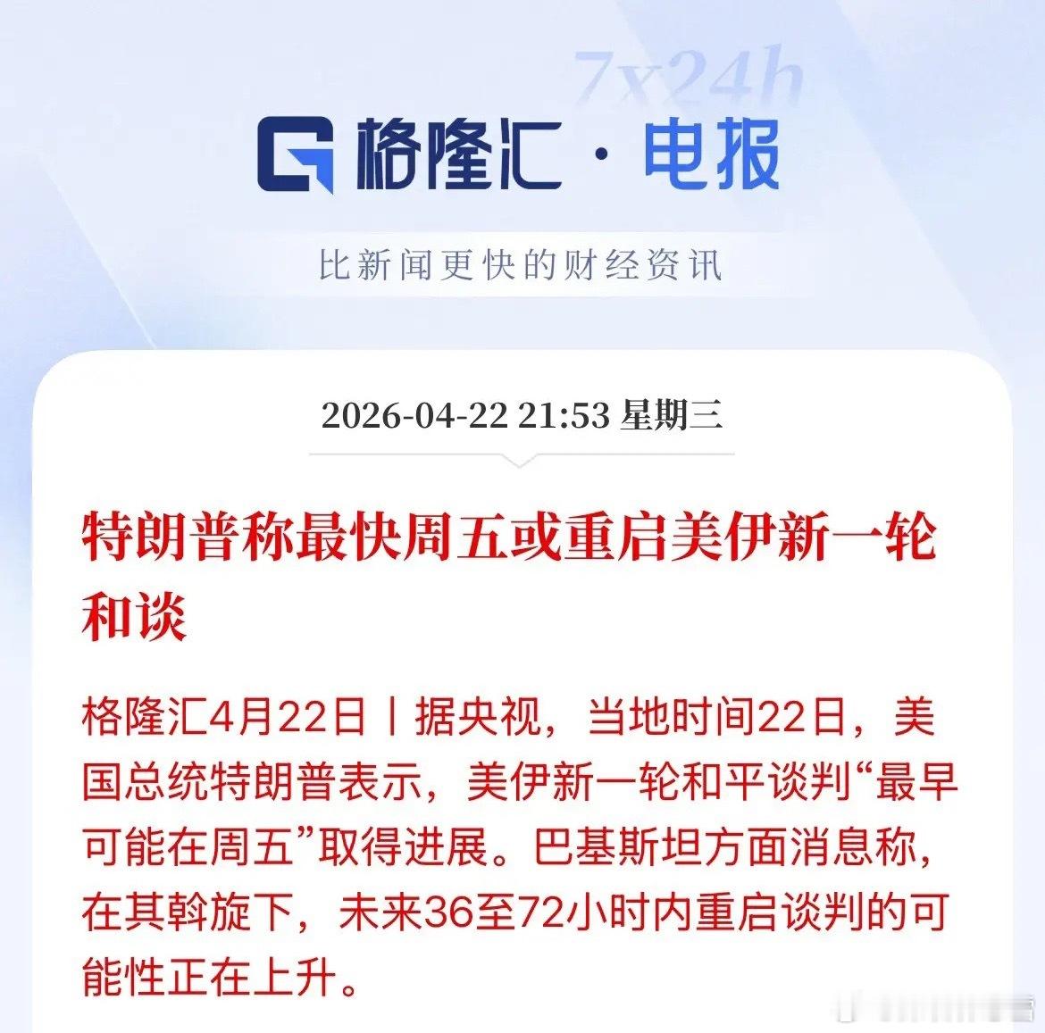 美伊局势又现新动向,美方接连释放缓和信号。消息传出,美伊最快将于周五重启谈判,巴基斯坦也表态,未来36至72小时谈判重启概率大幅攀升。