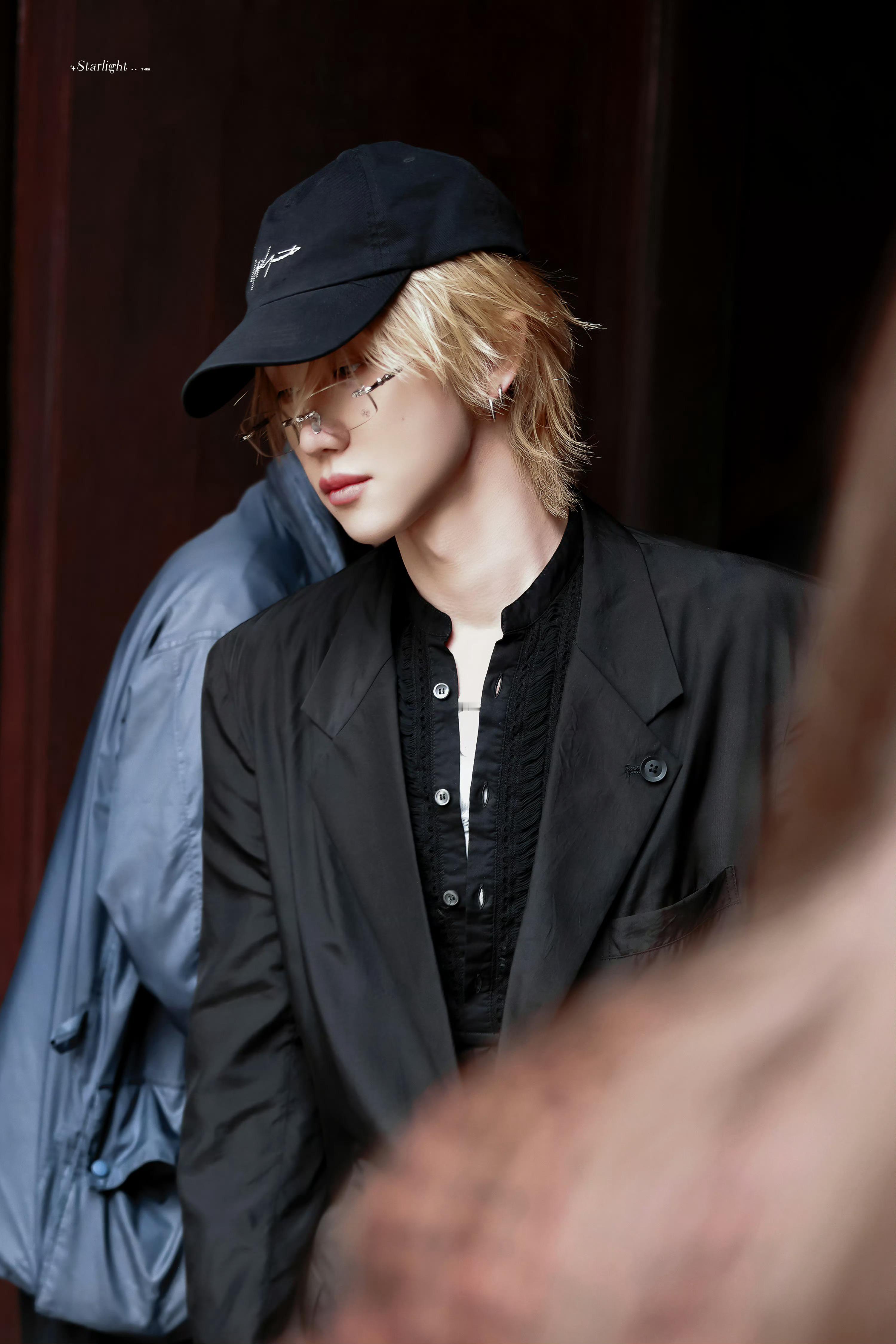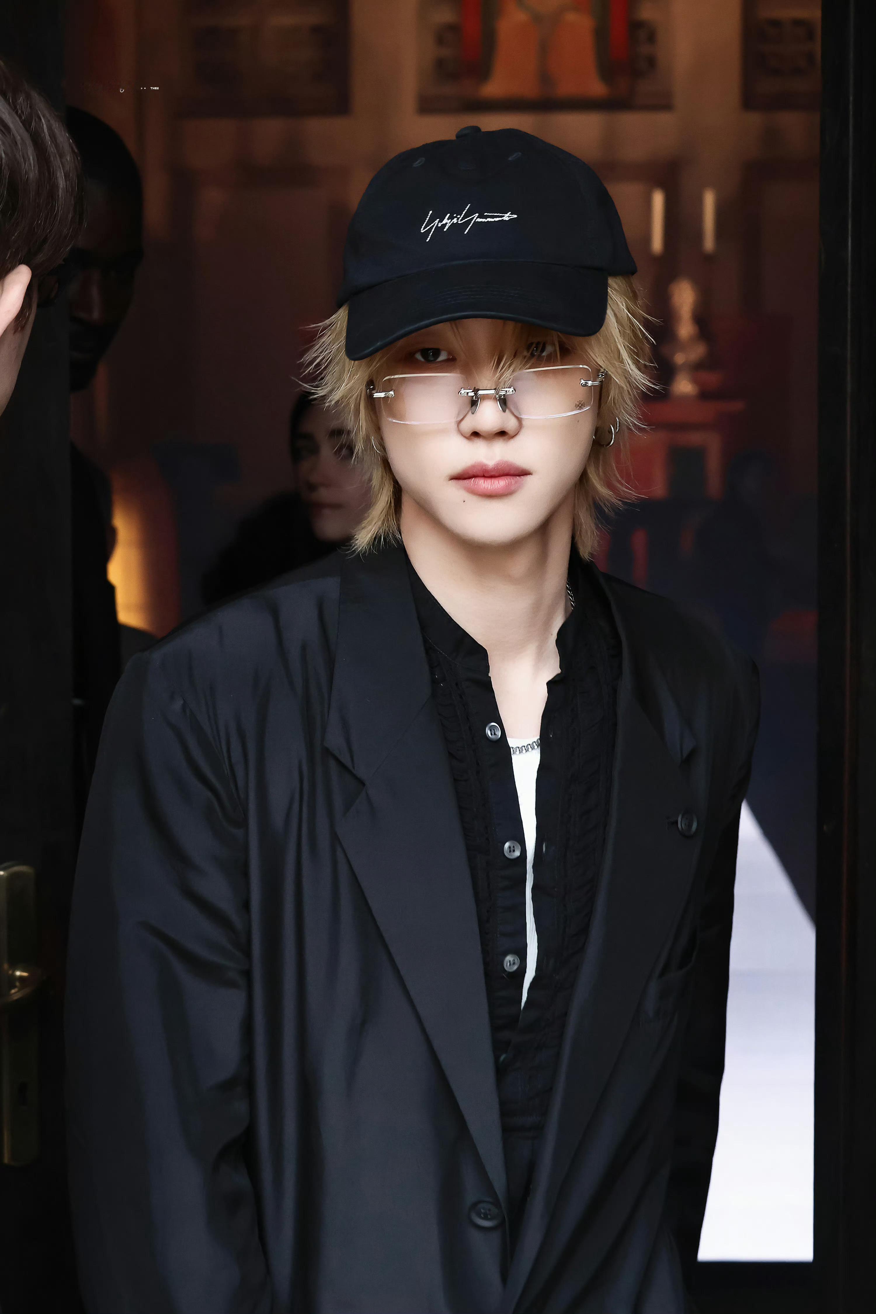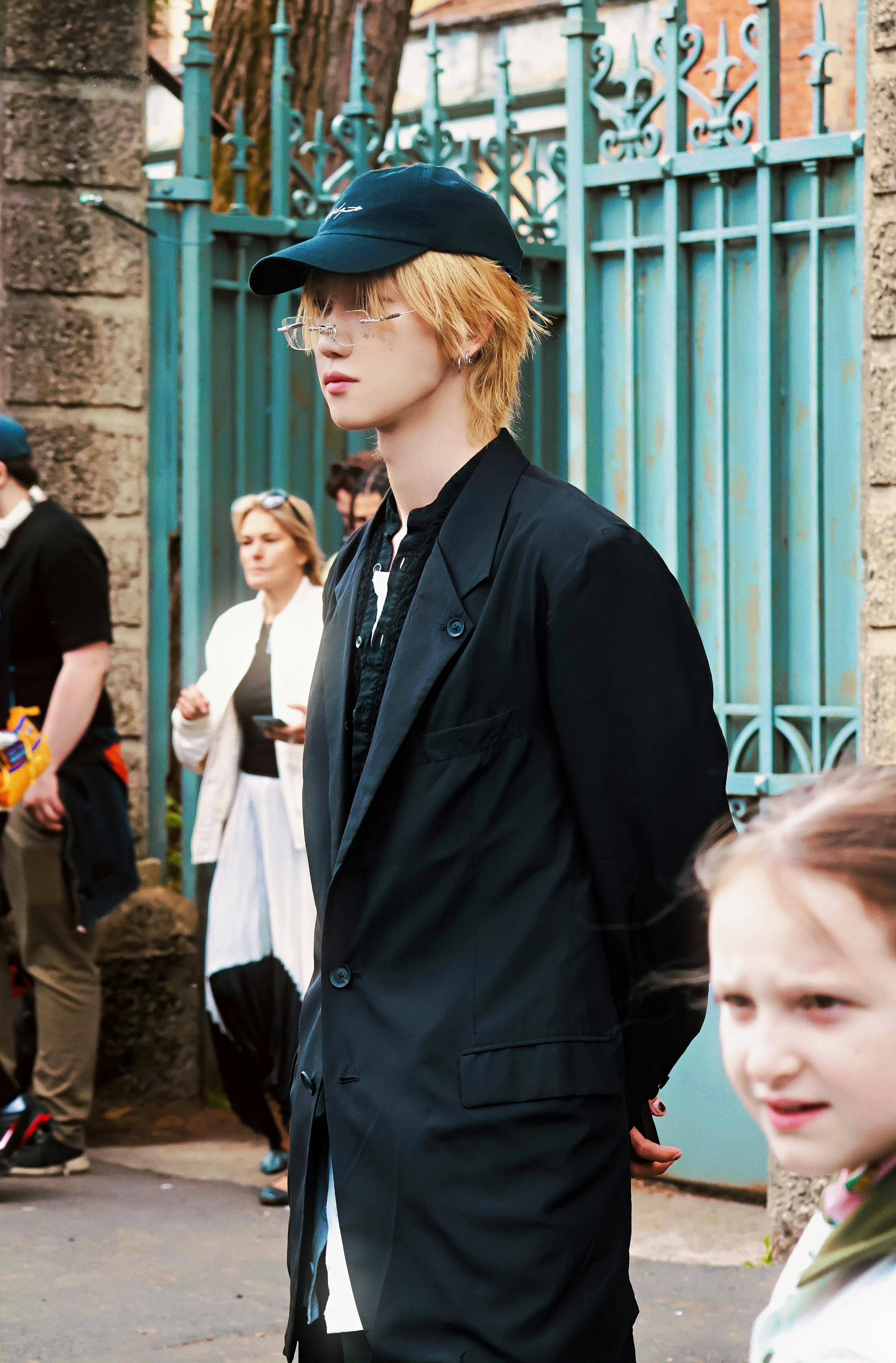 徐明浩亮相米兰设计周,一袭Yohji Yamamoto黑色西装套装内搭肌理衬衫与白T,三层叠穿层次分明;宽松廓形搭配棒球帽与无框眼镜,在文艺与冷冽间游走,松弛有型,自带高智感~🖤