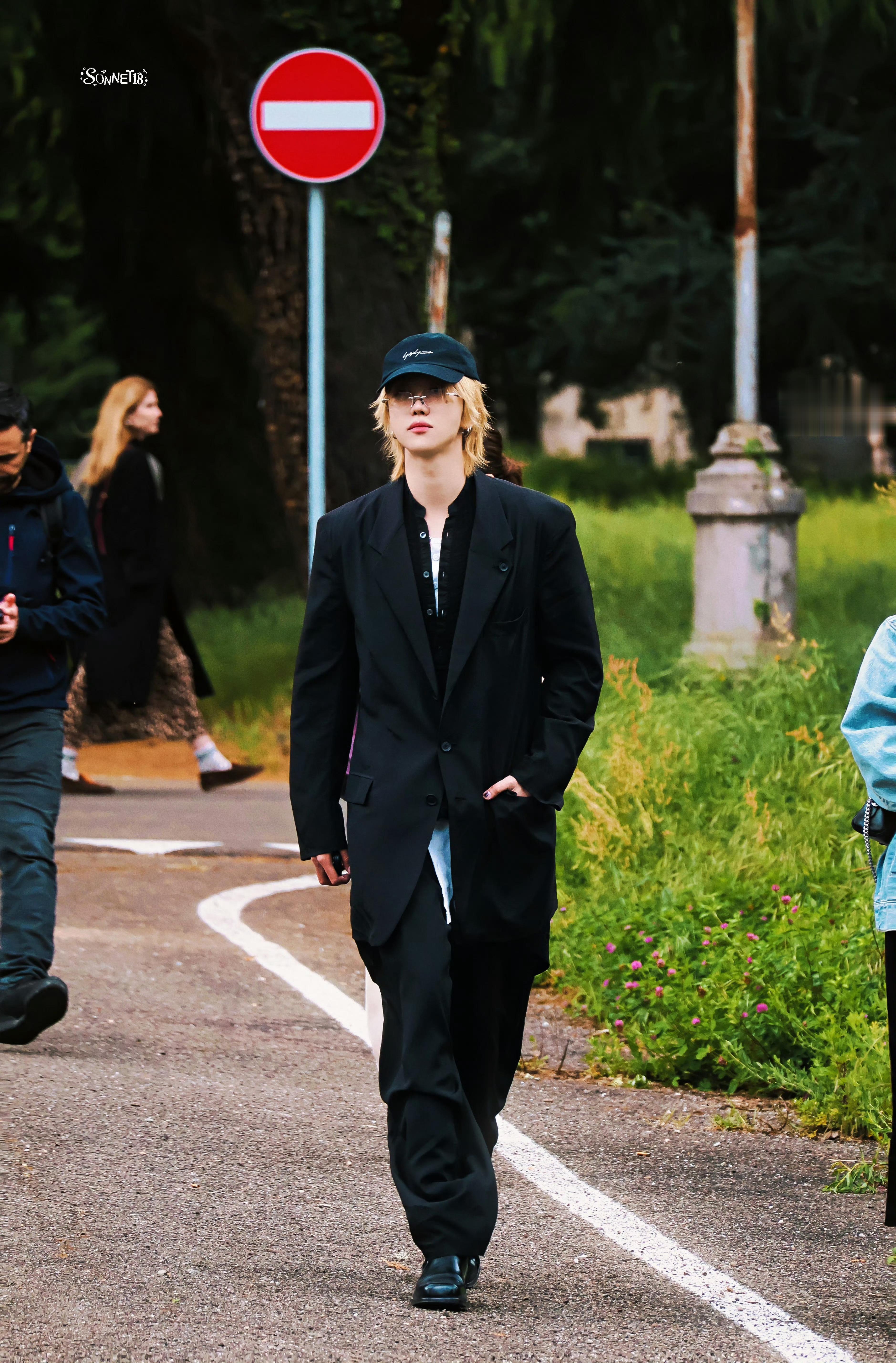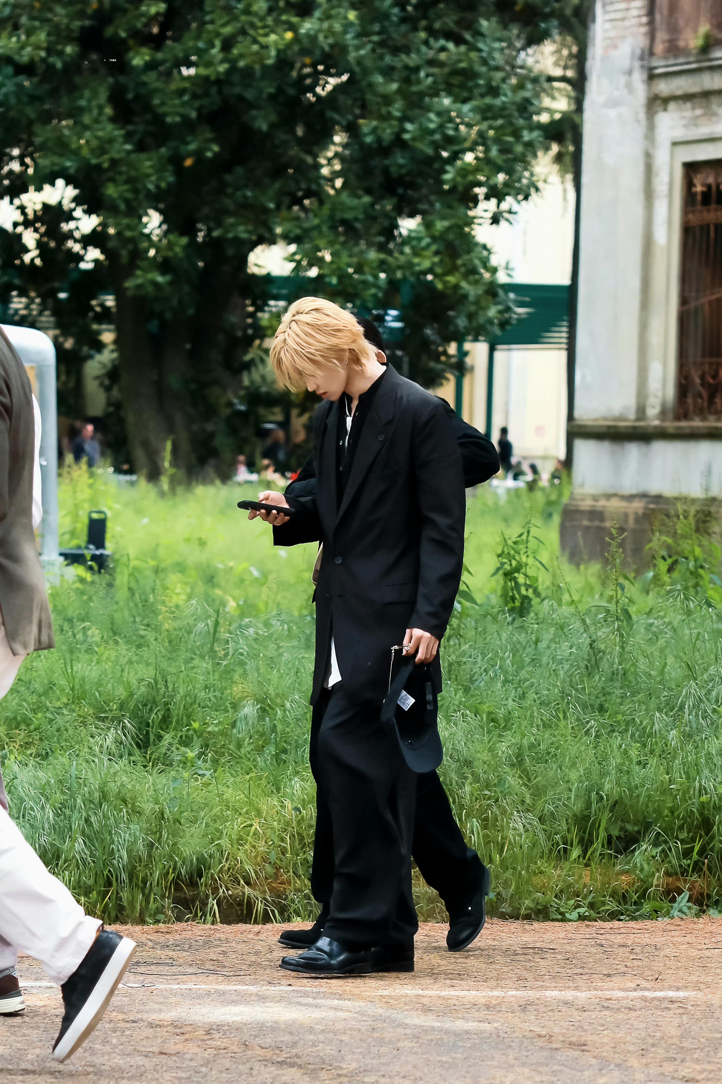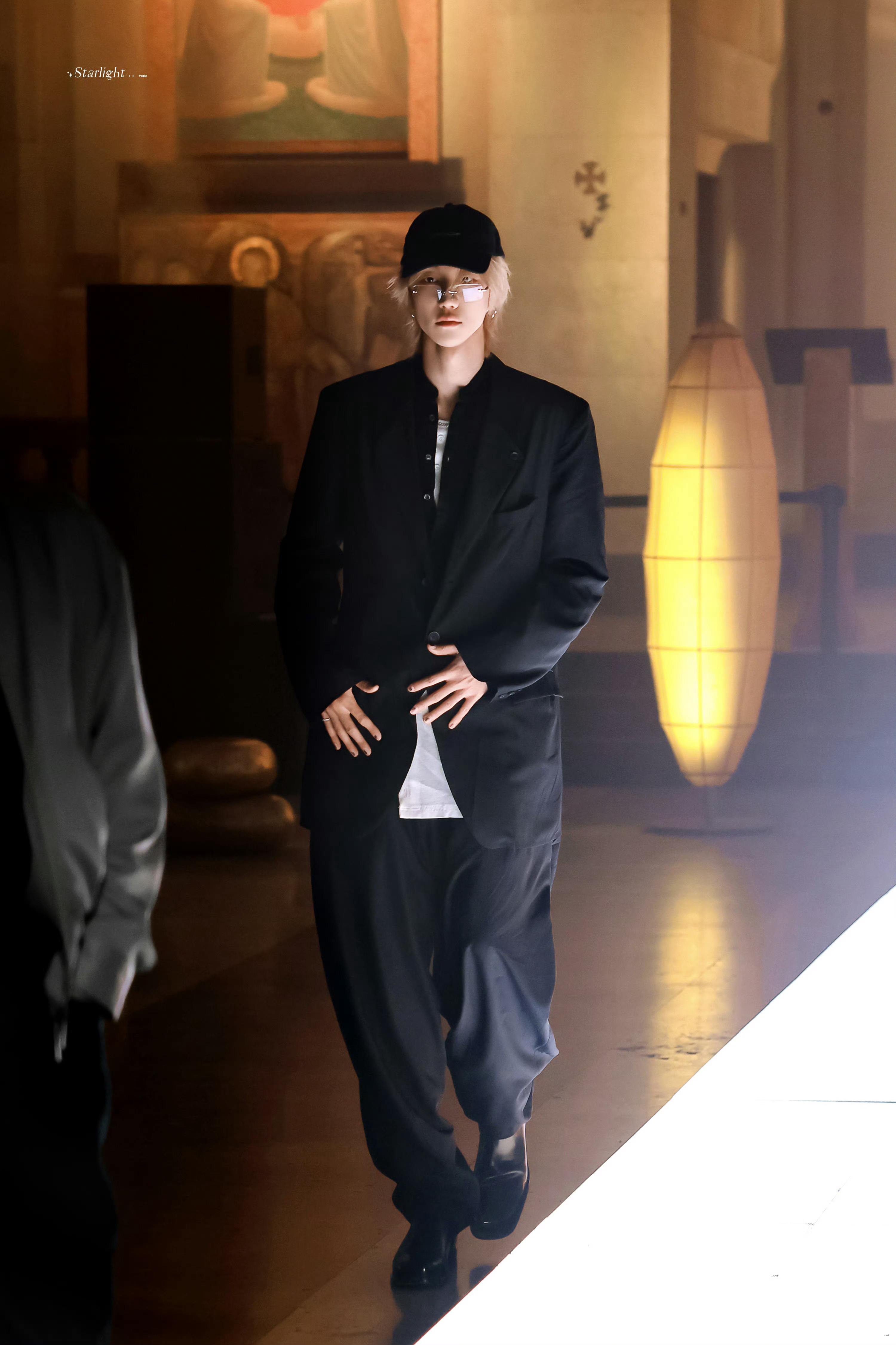 徐明浩亮相米兰设计周,一袭Yohji Yamamoto黑色西装套装内搭肌理衬衫与白T,三层叠穿层次分明;宽松廓形搭配棒球帽与无框眼镜,在文艺与冷冽间游走,松弛有型,自带高智感~🖤