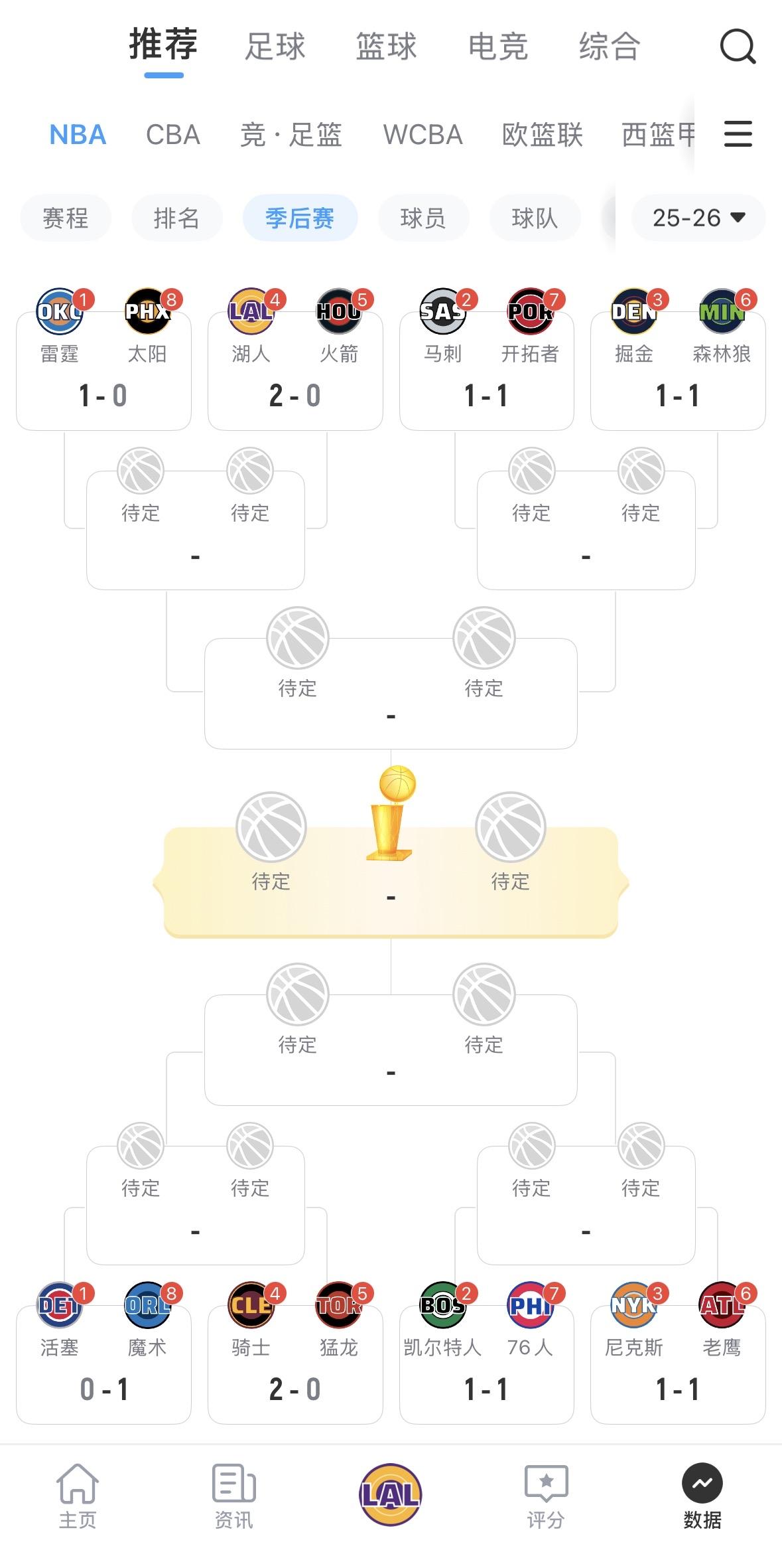 今年季后赛首轮比赛很有趣,就像: 西部第三掘金VS西部第六森林狼,两场比赛后战果1:1 东部第三尼克斯VS东部第六老鹰,两场比赛后战果1:1 西部第四湖人VS西部第五火箭,两场比赛后战果2:0 东部第四骑士VS东部第五猛龙,两场比赛后战果2:0 西部第二马刺VS西部第七开拓者,两场比赛后战果1:1 东部第二绿军VS东部第七76人,两场比赛后战果1:1