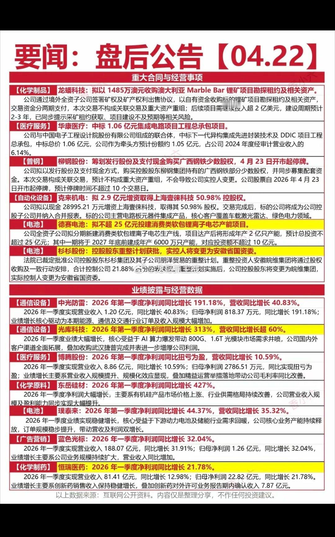 4.22周三 晚间 上市公司公告精选!
