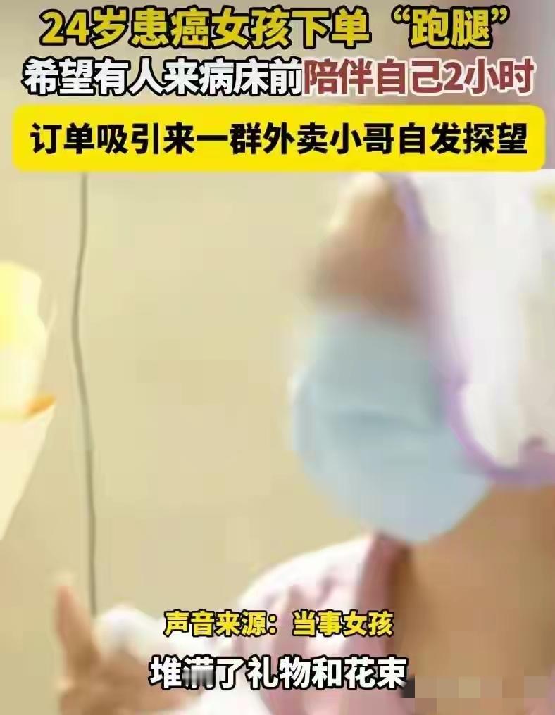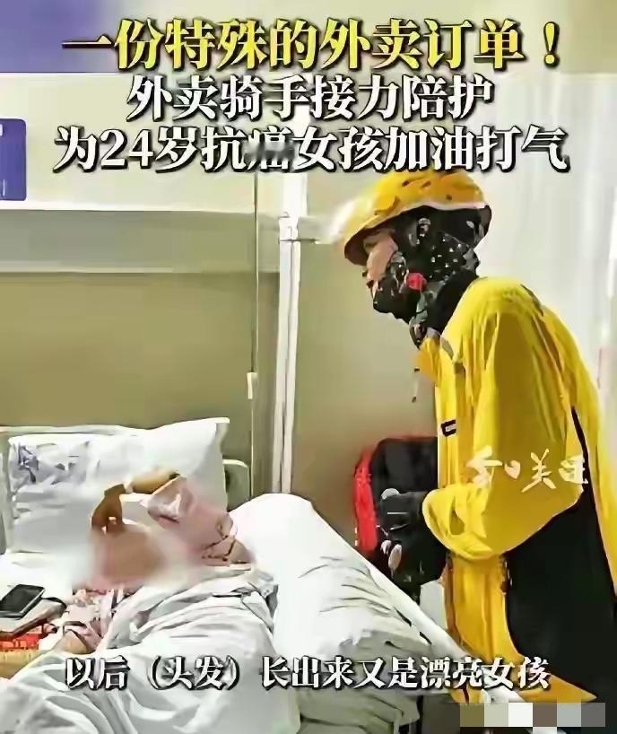 “陪我2小时”!24岁患癌女孩下特殊订单,全城骑手接力看哭全网 你敢信吗?一张没有东西要送、没有货物要取的外卖跑腿单,竟然刷爆了全网,撬动了一座城的善意! 4月15日,广东佛山复星禅诚医院,24岁的小黎刚做完第四次化疗,一个人躺在病床上,胃里翻江倒海,骨头缝里酸疼,身边没有一个人。 她打开外卖平台,下了一单跑腿。备注栏里只有一行字:“坐在病床旁陪我两个小时。” 这张特殊订单被派到了骑手小黎手中,没错他跟女孩同名,都叫小黎。 他一开始还以为是恶作剧,哪有花钱雇人陪坐的,这单跑腿费才几块钱啊。 可电话那头虚弱的声音让他心一紧,姑娘说我就是太孤单了,求求你。 小黎放下手头所有单子赶到医院,推开病房门那一瞬间眼泪差点掉下来。 24岁的姑娘头发掉光了,脸色蜡黄,床头柜上摆着止痛药和没动的盒饭。 他坐下来陪她聊天,给她剥了个橘子,姑娘笑了,说好久没人这样陪我了。 两小时很快过去了,小黎走的时候心里堵得慌,他把这事发到了骑手群里。 没想到群里炸开了锅,好几个骑手抢着说下一单我来,我接着陪她。 一个叫谭军的骑手更暖心,买了束鲜花带去,说病房里得有颜色才像话。 从此佛山这座城市多了一条特殊的外卖路线,骑手们接力往医院跑。 有人带粥、有人带水果、有人带书,还有个大姐陪姑娘聊了整整一个下午。 姑娘的床头慢慢堆满了小礼物,都是这群素不相识的骑手送来的心意。 小黎的主治医生听说了这事,红着眼圈说化疗病人最怕的就是孤独感。 那些疼得睡不着觉的夜晚,身边有个人说说话,比打止痛针都管用。 这群骑手送的不是外卖,是命悬一线时那口吊着人不倒下去的气。 网友们看完这事哭成一片,有人说看哭了,谁说这社会冷漠人心不古。 还有人说这些骑手平时被差评被投诉受尽了委屈,可心还是滚烫的。 一个女孩在评论里写道,如果有一天我也病了,希望也能遇到这样的好人。 小黎后来在社交平台上发了一段话,说谢谢佛山所有的骑手哥哥姐姐。 你们让我知道这个世界还有人惦记着我,我还有勇气做下一次化疗。 这话说得轻,可分量重得让人扛不住,24岁本该是最灿烂的年纪啊。 有人可能会问,这姑娘的家人呢?为什么化疗四次都是一个人扛着。 小黎没细说,只淡淡提了一句家里走不开,咱们也不忍心追问。 家家有本难念的经,可一个癌症病人独自扛化疗,这份苦谁能受得了。 这场接力到现在还没停,骑手们自发排了个班,每天固定有人去看她。 佛山这座城市因为一群送外卖的人,突然变得温柔得不像话。 谁说骑手只会在街头巷尾抢时间,他们也会在病床边停下脚步暖人心。 两个小时的订单,变成了一座城的守候,这大概是外卖平台最特别的一单。 没有商品交易,没有货物送达,只有人心换人心,真情换真情。 小黎姑娘你要加油啊,这么多陌生人等着你出院,想亲眼看看你笑起来的样子。 麻烦看官老爷们右上角点击一下“关注”,既方便您进行讨论和分享,又能给您带来不一样的参与感,感谢您的支持! 各位读者你们怎么看?欢迎在评论区讨论。
