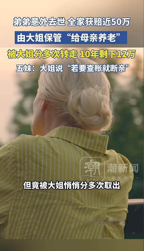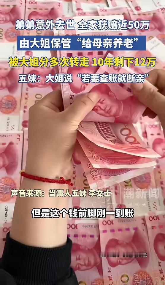 “太过分了!”河南开封,弟弟去世获得近50万赔偿,五姐妹想着用这笔钱给妈妈养老,最后钱由大姐保管,约定了谁都不能动,可母亲住院的时候,大家才知道这笔钱只剩12万了,面对质问,大姐反倒激动起来,还说要查账就断亲!网友:不地道! 事情要从十年前说起,河南开封的一户人家,家里最小的弟弟意外去世,还没来得及成家娶媳妇,最后拿到了49.7万的赔偿款,这笔钱像一块滚烫的石头,压在一家人的胸口,悲伤之余,大家也开始商量这笔钱的用处。 当时母亲已经82岁高龄,按照法律规定,这笔赔偿款本该归母亲所有,但五个姐妹坐在一起商量后,决定把这笔钱集中起来,专款专用,专门留给母亲看病、养老,不让母亲以后的生活有后顾之忧。 商量来商量去,大家一致决定把钱交给大姐保管,理由简单又实在,大姐是家里的老大,平时家里的大事小情都是她张罗,姐妹们都信得过她,没人能想到,就是这一句“信得过”,最后竟害了一家人。 姐妹们当时只做了口头约定,说好这笔钱谁都不能随便动,只能用在母亲身上,既没有签书面协议,也没有建立监督机制,甚至连一本像样的账本都没有,大家觉得都是一家人,没必要分得那么清楚,可这份省心,最后却酿成了大麻烦。 赔偿款到账才两天,银行流水就显示,有5万块钱被取走了,取钱的正是大姐,她说是自己临时急用先借一下,姐妹们得知后也没有太较真,觉得谁家都有手紧的时候,都是亲姐妹,互相帮忙也是应该的,没人多想,也没人要求她写借条或者说明用途。 可大家的包容和信任,却让大姐变得越来越肆无忌惮,几年后银行流水里又出现了一笔大额转账,31万悄无声息地被转走,这一次大姐没有告诉任何一个妹妹,就这么私自处置了这笔本该属于母亲的养老钱。 就这样这笔近50万的赔偿款,在姐妹们不知情的情况下,一点点被挪用,直到去年母亲生病住院,需要支付医药费的时候,此事终究纸包不住火,大姐寻来几位妹妹,提出让她们先行垫付母亲的医药费,其缘由为她所保管的赔偿款已然所剩寥寥。 五妹心里犯起了嘀咕,她实在不相信,一笔近50万的养老钱,没几年就花得差不多了,于是她特意跑了一趟银行,打印了这笔钱的流水单,当流水单摆在五个姐妹面前时,所有人都傻了眼,原本49.7万的赔偿款,如今余额栏里清清楚楚地写着120000元,只剩下一个零头足足少了38万。 震惊之余五个姐妹找到大姐,当面质问她那38万到底去了哪里,要求她把账目说清楚,可大姐的反应却出乎所有人的意料,面对姐妹们的质问,她不仅没有丝毫愧疚,反而变得十分激动,甚至放出狠话:你们要查账是吧?那就断亲。 “断亲”这两个字,像一把尖刀,扎在每个姐妹的心上,屋里瞬间变得安静,安静得能听见每个人的心跳声,姐妹们心里满是委屈和愤怒,当初把钱交给她保管,不就是因为信她吗?如今钱少了,问一句都不行,竟然还要用断亲来威胁。 后来大姐夫出来打圆场,说那笔钱并没有乱花,一部分用来支付了律师费,还有一部分给姐妹们分了辛苦费,每人两万,可几个妹妹异口同声地表示,她们压根就没见过这笔所谓的辛苦费,大姐夫的解释,不仅没有平息矛盾,反而越描越黑,让姐妹们更加怀疑大姐是在故意隐瞒。 其实从法律上讲,这件事还真不好界定,弟弟没结婚、没孩子,赔偿款按继承顺序本该归母亲所有,姐妹们之间的口头约定,没有签字、没有按手印,在法律上几乎没有效力,大姐私自把钱取出来使用,严格来说并不违法。 可这件事的问题从来都不在法条上而在人心上,十年前的约定,靠的是血脉相连的信任,姐妹们出于对大姐的信任,放心地把母亲的养老钱交给她,可她却辜负了这份信任,私自挪用甚至在被质问时,用断亲来逃避责任。 那消失的38万到底去了哪里,至今没人能说清楚。母亲这些年身体还算硬朗,偶尔吃点药、住几次院,根本花不了这么多钱,这笔钱就像沙子一样,从指缝里悄悄漏掉,漏得无声无息,也漏光了姐妹们之间的信任。 今年4月20日这件事被媒体曝光后,经过调解大姐答应把账单理清楚,姐妹们也继续轮流照顾母亲,表面上看事情好像解决了。可那38万的窟窿怎么填?账目能不能真正对上?姐妹们之间裂开的人心,还能不能重新缝好?没人敢打包票。 82岁的老母亲躺在病床上,大概永远也不会知道,自己的几个女儿,为了她的养老钱,竟然闹到了断亲的边缘,弟弟的去世已经是一场悲剧,如今姐妹反目,又是一场让人痛心的悲剧,钱这东西,最能试出人心的深浅,当初一句简单的“信得过”,换来的却是十年的沉默和一张余额只剩十二万的流水单,实在太过分也太寒心了。 (信息来源:《“若要查账就断亲!”弟弟去世获赔近50万,由大姐保管给母亲养老,不到十年剩12万,五姐妹吵到要断绝姐妹关系》潮新闻)