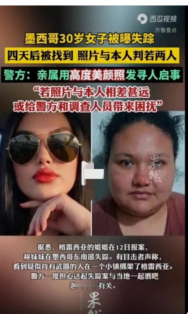 国外一女子失踪,家属用美颜俢图照发寻人启事,导致调查人员认不清本人,四天后才找到,本人与照片完全没有相似之处。 有些平常相貌平平的人,拍照片视频都是美如天仙,身材又好,实际上现实中长得非常普通。