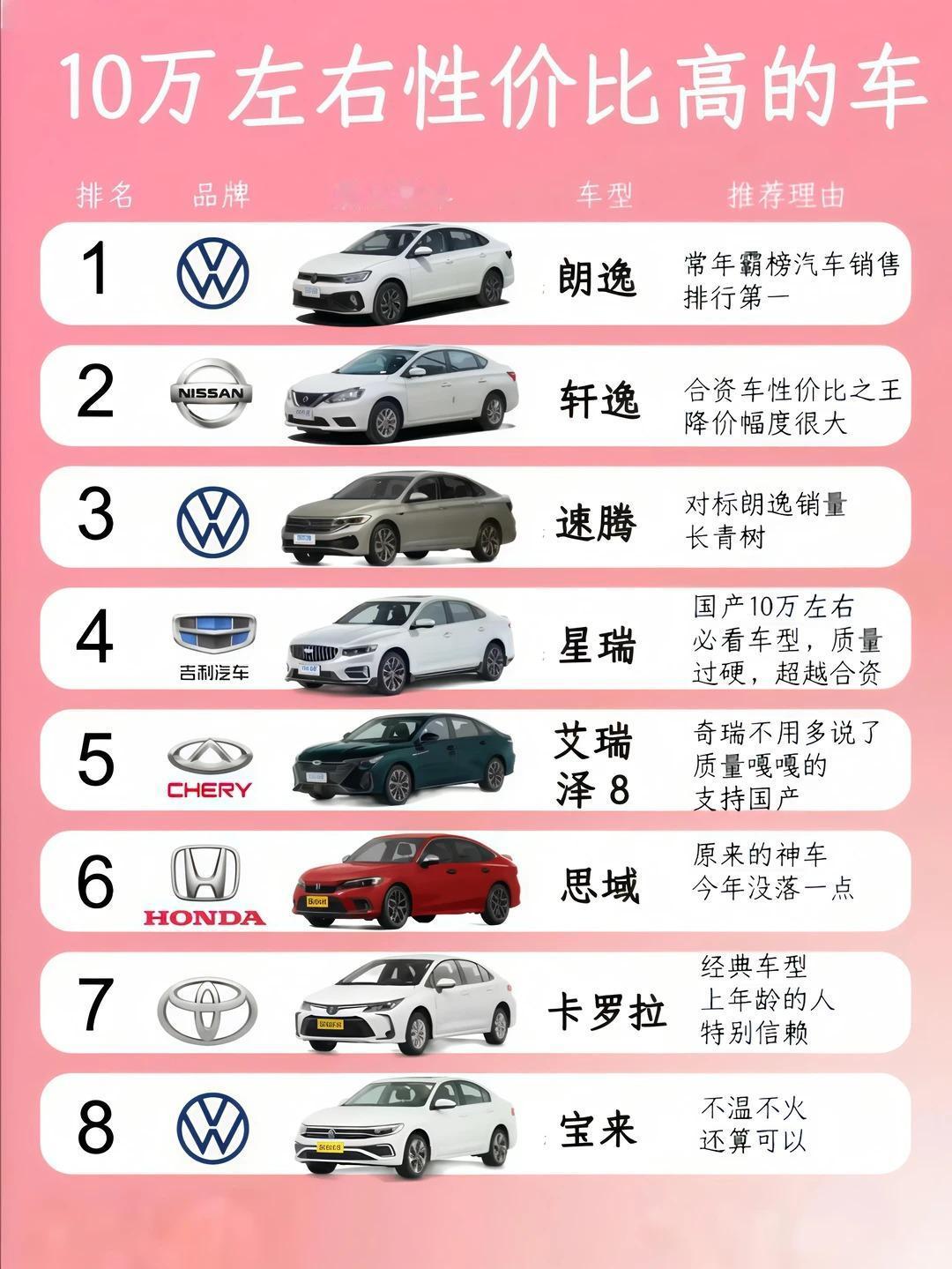 10 万左右高性价比燃油轿车 TOP8✨新手闭眼抄作业 预算 10 万想买家用燃油轿车,纠结选哪款? 这份榜单涵盖合资、国产热门车型,结合销量、口碑、产品力完整排名,优缺点清晰,选车不踩坑! 1️⃣大众朗逸 常年稳居轿车销量榜首,市场保有量巨大,省油耐用、养护成本低,底盘稳定靠谱,家用代步全能标杆。 2️⃣日产轩逸 合资车性价比之王,终端优惠力度大,座椅舒适被誉为 “移动大沙发”,油耗经济,家用通勤代步首选。 3️⃣大众速腾 对标朗逸的德系常青树,车身空间更大,底盘质感更扎实,行驶稳重,综合产品力均衡稳定。 4️⃣吉利星瑞 10 万级国产轿车首选,整车用料扎实、动力强劲,底盘质感越级,综合产品力超越同价位合资车型,性价比拉满。 5️⃣奇瑞艾瑞泽 8 国产品质标杆,三大件可靠性出众,车身做工扎实,配置丰富,兼顾家用舒适与稳定耐用,支持国产优选。 6️⃣本田思域 曾经的家用神车,动力操控优秀,改装潜力大,如今性价比依旧能打,适合偏爱运动风格的年轻用户。 7️⃣丰田卡罗拉 经典家用神车,质量极其稳定,故障率极低,省油保值,是中老年用户、省心代步的稳妥之选。 8️⃣大众宝来 风格中庸均衡,无明显短板,好开耐用,终端价格亲民,适合追求稳妥低调家用代步的用户。 💡选购总结 追求省心保值选合资:朗逸、轩逸、卡罗拉 看重动力配置、越级品质选国产:星瑞、艾瑞泽 8 偏爱运动操控:本田思域【来自懂车帝车友圈】