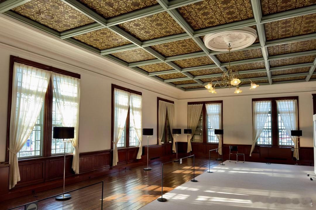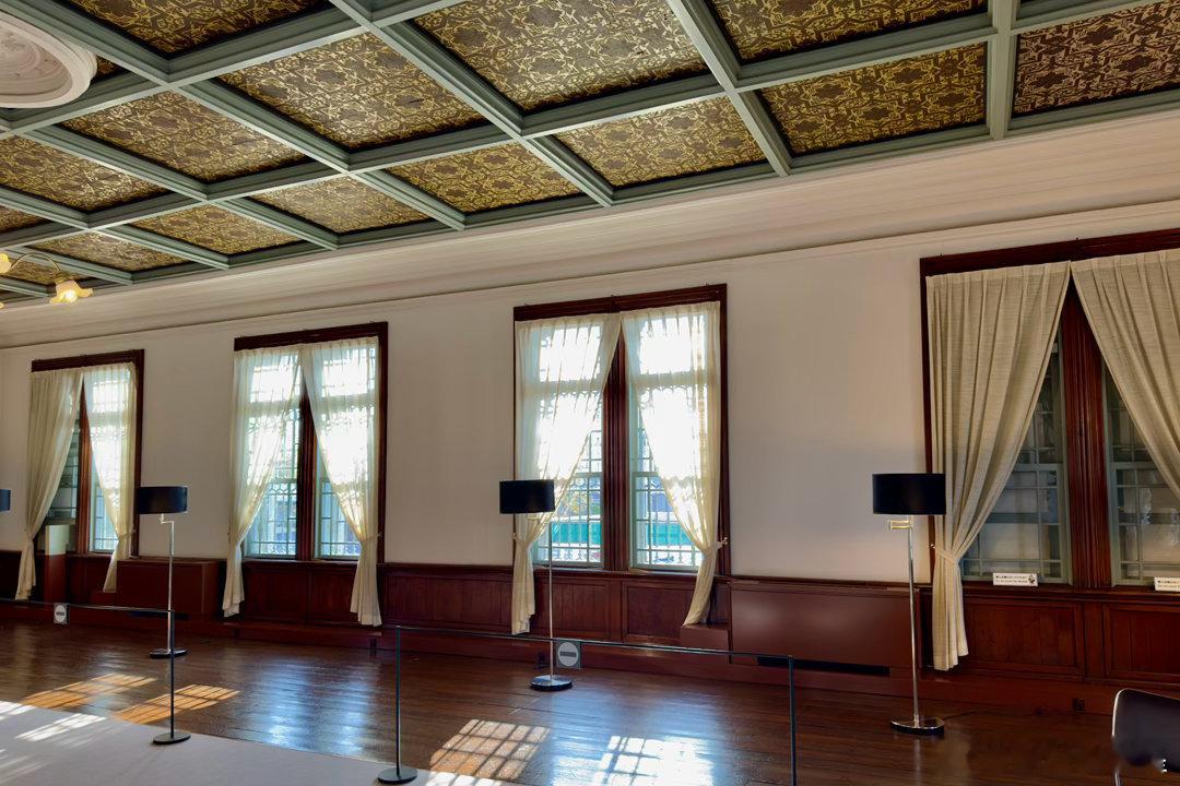 这是一座木造二层建筑,外观采用文艺复兴风格,以白色和薄荷绿为主色调,整体左右对称,给人稳重而优雅的感觉。 外部正面中央设有兼作展望台的装饰塔,塔顶装饰有类似印度寺院风格的相轮。内部采取和洋折衷手法,使用青森县产的榉木和桧木。天花板等处装饰有华丽的金唐革纸(金色压花皮革纸),风格古典而奢华。