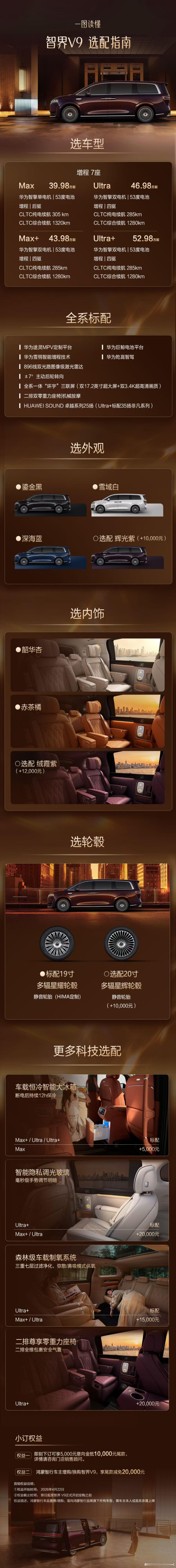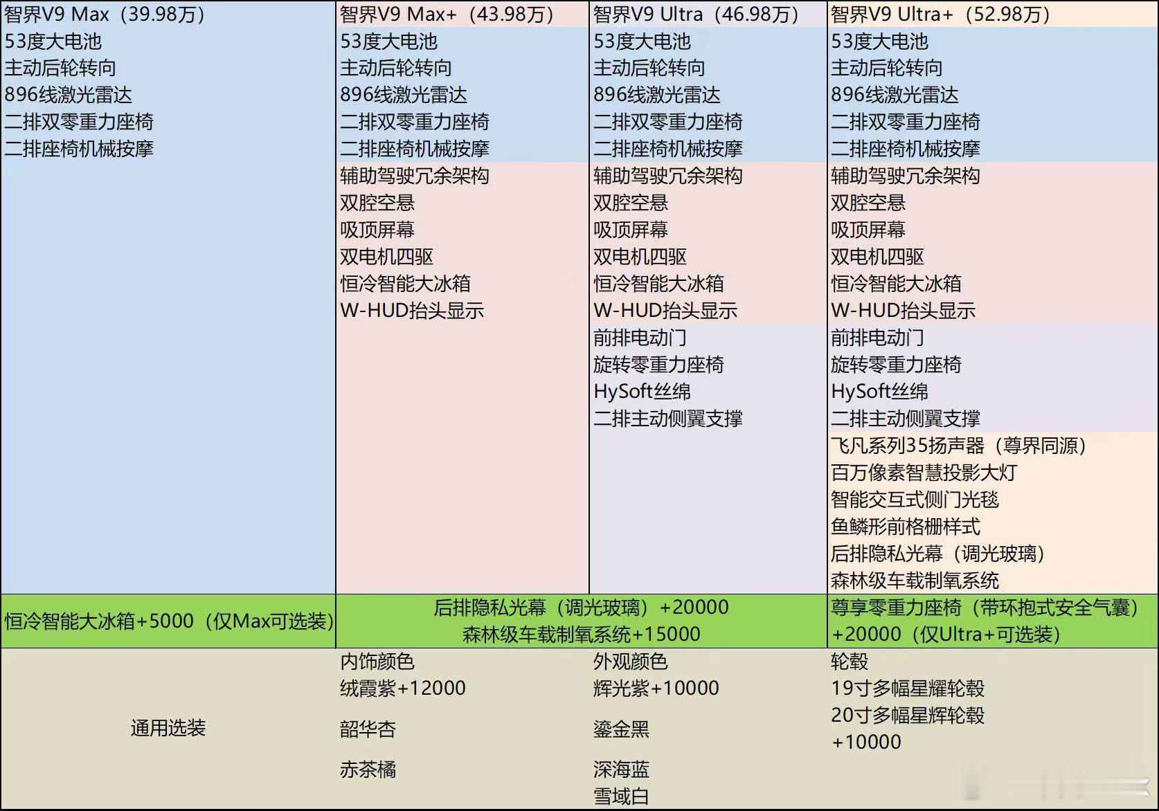 智界V9的一图选购指南来了,实话说如果我自己买应该会直接上顶配Ultra+,因为比较看重这几项配置: