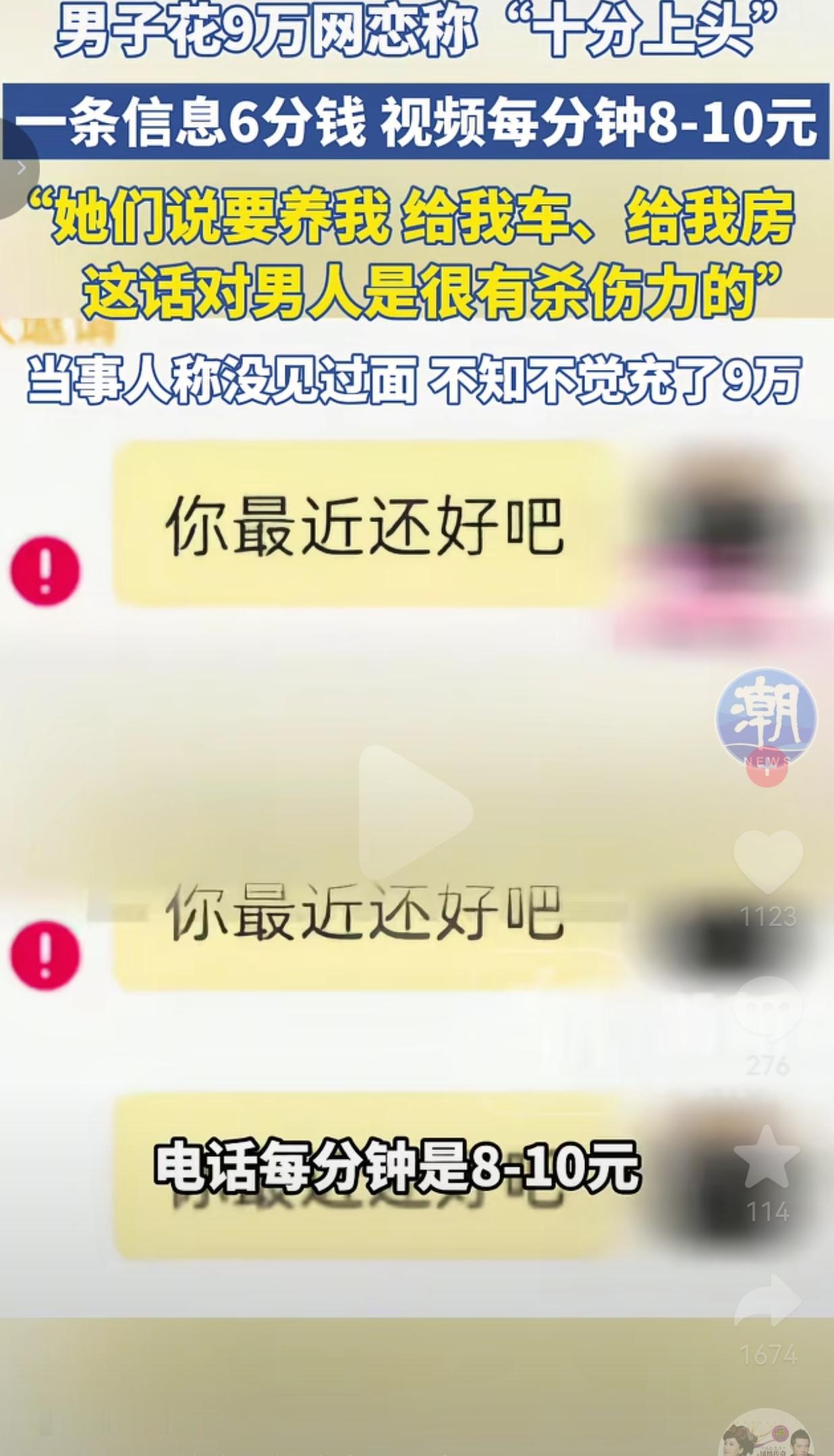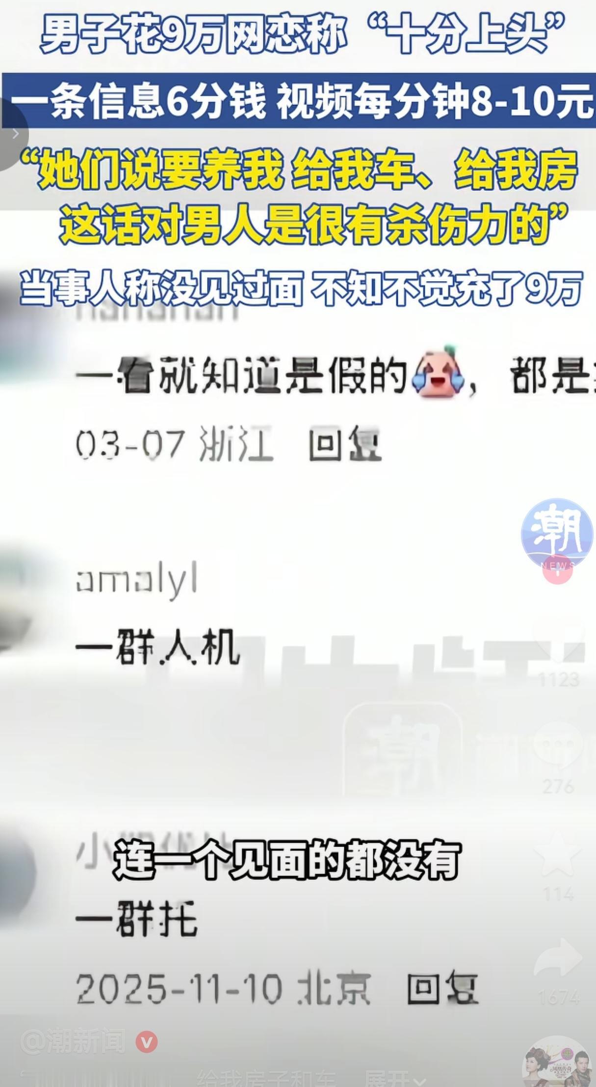 没见过面的网恋花费近9万,虚幻的甜言蜜语值得警惕。 深圳的谭先生,在交友软件上被“爱情”冲昏了头,愣是给没见过一面的网友,前后砸了近9万块钱。这事说起来,简直就是不少人网恋踩坑的真实写照。 他在某交友平台上,认识了几位看上去温柔体贴的异性网友。 对方跟他聊天、互动,一口一个关心,还时不时抛出甜言蜜语:“以后我照顾你,房车都可以是你的。” 谭先生说,这话对他真的太有杀伤力了。他本身有些自卑,觉得自己条件普通,突然有人对他这么“大方承诺”,整个人瞬间就飘了,一头扎进了这场虚幻的感情里。 可他没留意,平台上的互动都是按条、按分钟计费的,发消息、打视频都在不断扣费。一百块钱根本聊不了多久,他却越聊越上头,不知不觉就充值了将近9万。 他和对方聊得热火朝天,甚至到了谈婚论嫁的地步,天天互道晚安,满心觉得找到了归宿,可从头到尾,一次面都没见过。 直到后来他察觉不对劲,才发现有些账号信息高度相似,这才猛然惊醒,自己很可能陷入了一场精心包装的虚假交友套路里。 事后平台也回应称,如果查实有人伪造身份、虚假承诺,会对账号进行封禁处理。但谭先生付出的这笔钱,早已在一次次互动中消耗殆尽。 网友的评论,更是把这事儿扒得明明白白: 有的网友说:“大哥,人家说给你车给你房,你居然信了?现实里哪有这么天上掉馅饼的好事?” 也有的网友说:“别笑他,我之前也差点栽进去。这种平台的话术,真的能把你捧得云里雾里,感觉自己就是天选之子。” 还有的网友说:“说白了,就是抓住了人那点可怜的自尊心。现实里得不到认可,网上有人把你捧上天,谁不上头?” 更有网友表示:“最可怕的是,他花了9万,连个人影都没见着。这钱拿去干点啥不好,现在可好,纯纯交了智商税。” 我看完这事儿,真的一点都不同情,甚至想骂一句:活该。 你说他傻吧,他又不傻,他就是太贪了。贪什么?贪那点不切实际的优越感。 人家几句甜言蜜语,他就忘了自己几斤几两,忘了天下没有免费的午餐。对方把他当提款机,他还把对方当真爱。 别总说谁好骗,这根本不是被动被骗,是自己主动送上门。真正的感情,是两个人双向奔赴,是要见面、要相处、要走进真实生活的。而不是隔着屏幕,对着一个看不清真假的账号,疯狂砸钱。 这些交友套路就是吃准了这一点:你想在网上找存在感,他们就给你造一个完美人设;你想被崇拜,他们就把你捧上天。等你钱花光了,所有温柔都会瞬间消失。 我就想跟所有人说一句:别再做白日梦了。真正靠谱的感情,从来不是靠网上几句承诺撑起来的。需要你不断砸钱才能维持的“好感”,全是生意,没有例外。 最后,我奉劝所有人一句话:别拿你的血汗钱,去给别人的表演付费,因为,你付不起!