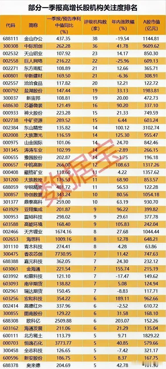 这份数据统计了46只股票的机构持仓情况,有个现象值得留意:机构正在明显“高低切换”。 高持仓不代表高涨幅。 像金山办公、巨人网络,机构持股比例都超20%,但今年以来股价反而跌了近20%。 反观东山精密、大族激光,机构持股仅14%左右,股价却翻倍了。 两类公司受青睐: 1. 科技制造:芯片设备(芯基微装)、精密制造(震裕科技)等业绩增速超50%的公司,机构愿意给更高估值。 2. 周期反转:锂电材料(新宙邦)、铝加工(神火股份)等,业绩增长20%-30%,属于“稳稳的幸福”。 特别注意: 中际旭创股价暴涨41倍,机构反而只持有36%——说明很多机构可能在高位减仓了。欧科亿更极端,机构持股高达2509%(注:此为数据单位疑误,应为万股或比例,原文如此),但业绩增长203%,典型的“机构抱团”。 一句话总结: 别再追那些机构扎堆但股价不涨的票了。真正值得看的,是机构刚加仓、业绩爆发、股价还没大涨的细分龙头。 (风险提示:数据仅供客观参考,不构成投资建议,市场有风险,决策需谨慎。)