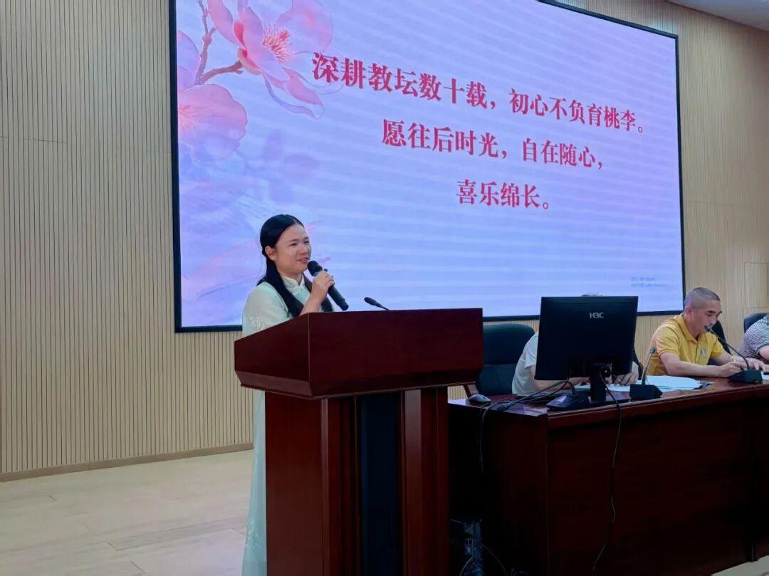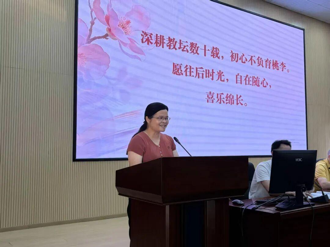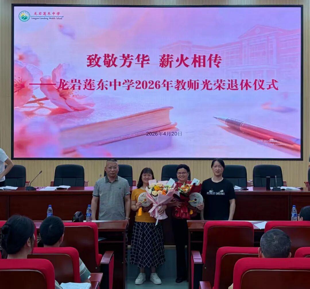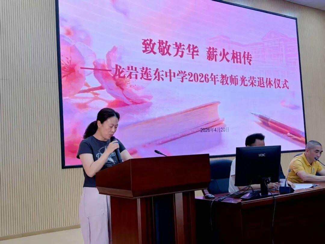 福建省龙岩莲东中学游秀骞、曾九金退休仪式 4月20日举行,李焕辉副校长主持,林荣光书记致辞并与游清女校长为两位老师献花、颁发荣退纪念品,教师代表王玫、刘丽蓉依次发言——致敬前辈、送上祝福,李焕辉副校长总结致辞。