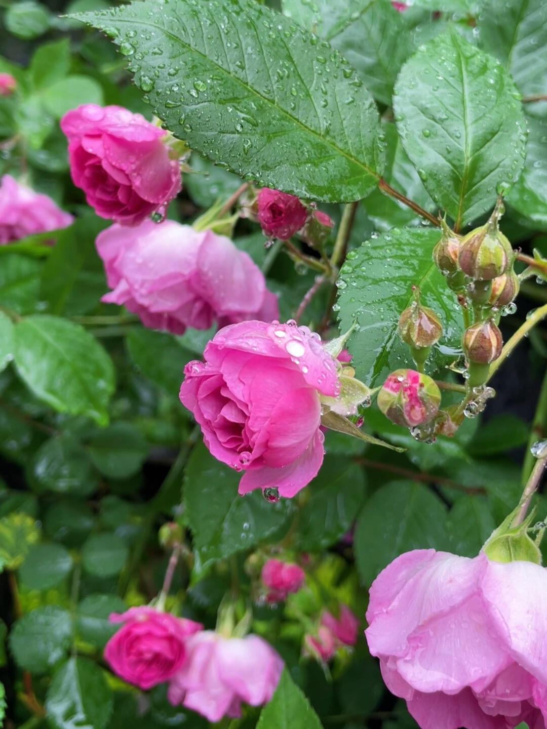 小区的花园里的月季一片粉红,深深浅浅,热热闹闹地开在绿叶丛中。有淡粉的,像少女脸