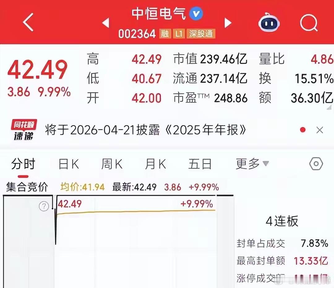 宁德时代41亿砸向它!连续4个涨停板,让7万股民一夜无眠?中恒电气连续4个涨停板,股价从不到30块直接拉到42.49元,创下历史新高,市值一口气冲到239亿。更刺激的是,这波暴涨的导火索来自一个重量级玩家的入场。动力电池龙头宁德时代,拿出了41亿真金白银,间接入股中恒电气。7.5万股民突然发现自己手里的票成了香饽饽。但很多人可能并没有听说过这家公司,它到底是做什么的?宁德时代又为什么要砸这么多钱?要搞清楚这个问题,得先明白中恒电气是干什么的。这家1996年成立的杭州企业,最早是做通信电源起家的,后来一路转型,现在最核心的业务是数据中心电源。说得通俗点,就是给云计算、AI算力中心这些大型机房供电的设备。2024年,公司数据中心电源收入6.7亿元,占总营收的34.1%,到了2025年上半年这个比例进一步提升到45.66%,成了第一大收入来源。在这个领域,中恒电气有一项绝活叫HVDC,也就是高压直流供电系统。传统数据中心用的是UPS交流供电,电要经过交流变直流再变交流两次转换,效率有损耗。HVDC直接用直流供电,少了一次转换,效率更高、占地更小、故障率也更低。中恒电气是国内最早推动HVDC在数据中心应用的企业之一,还牵头制定了这个领域的国家标准。根据科智咨询的数据,2025年智算中心HVDC市场前三名合计拿走了72%的份额,中恒电气以31%的市占率排名第一。公司和国内头部互联网企业的合作超过十年,在某大型互联网公司数据中心的HVDC份额一度接近70%。2019年公司还联合行业伙伴发布了巴拿马电源方案,把中压配电、变压、整流等多个环节集成到一个模块里,全链路效率提升2到3个百分点,占地面积减少约60%。宁德时代掏41亿,不是心血来潮。它要的是一个能够打通储能电池和数据中心电源之间技术壁垒的合作伙伴。宁德时代做电芯全球最强,但在数据中心末端的电力转换和系统集成方面是短板。中恒电气恰好补上了这一环。双方合作的方向叫算电协同,简单说就是让算力和电力两套系统深度融合、互相赋能。算电协同这个词,很多人可能第一次听说。但它已经被写进了2026年政府工作报告,和超大规模智算集群并列为新基建工程的核心内容。从一个行业概念正式上升为国家战略,这个信号非常强烈。为什么这么重要?因为AI太吃电了。2025年全国数据中心的用电量达到1933亿度,占全社会用电量的1.9%。看起来不算多,但增速惊人,2026年前两个月这个数字同比暴增了46.2%。罗兰贝格的测算更夸张,到2030年全国数据中心年用电量将超过8000亿千瓦时,是现在的4倍多。光靠传统方式已经扛不住了。政策明确要求新建大型数据中心使用绿电占比要超过80%。这就需要把西部的风电、光伏发的电稳定高效地送到东部的算力中心,同时还得配上储能系统来削峰填谷。这整套从发电到储能到配电的体系,就是算电协同的核心。从投资规模来看,国信证券的研究显示,2030年全球AIDC电力设备市场空间有望达到4136亿元。其中HVDC加固态变压器这个细分领域,到2030年全球市场空间有望达到620亿元,年均复合增速超过80%。中恒电气站在了这条赛道最核心的位置上。宁德时代入局也绝非只冲着中恒电气一家,它已经和商汤科技合作,在上海临港的智算中心建了一套17.888兆瓦的储能系统。运行4个月后经测算,年化节省电费近1000万元,电费成本降低了7%。这是算电协同落地的真实样板。故事虽然性感,但回到基本面,中恒电气的财务数据并不算亮眼。2024年全年,公司营收19.6亿元,同比增长26.1%。归母净利润1.1亿元,同比增长178.5%,看起来不错。但利润基数太低了,绝对值并不大。到了2025年前三季度,情况变得微妙。营收14.18亿元,同比增长20.29%,收入还在涨。归母净利润0.73亿元,同比下滑了15.59%。典型的增收不增利。原因也不难理解。HVDC行业虽然需求旺盛,竞争也在加剧,产品价格承压。同时公司在研发上持续投入,2022到2024年研发费用占营收比例分别是11.06%、9.47%和8.15%,三年累计投入超过4.5亿,这些都会短期吃掉利润。不过从另一个角度看,这恰恰说明公司还处在投入期。券商预测2025到2027年中恒电气的归母净利润有望达到1.46亿、2.85亿和5.12亿,年均增速超过80%。如果海外HVDC订单在下半年加速落地,利润释放的速度可能更快。公司已经通过在新加坡设立合资公司,打造海外品牌,而海外HVDC的毛利率普遍在40%左右,显著高于国内20%到30%的水平。当然话说回来,中恒电气目前市盈率已经超过200倍,239亿的市值对应2024年仅1.1亿的净利润,估值确实不便宜。宁德时代入股对价隐含的估值大约是42元每股,和当前股价已经基本持平。四个涨停板之后,短期预期打得比较满了。中恒电气当前市盈率超过200倍,4天累计涨幅46.37%。宁德时代战略合作尚为框架协议,正式交易存在不确定性。股市有风险,投资需谨慎。