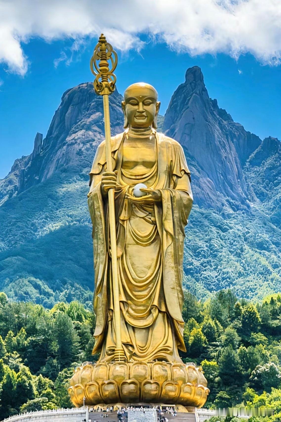 九华山上,那尊99米的金色大愿 站在九华山下仰望,阳光穿过云层,为99米高的地藏王铜像镀上一层温暖的光晕。锡杖在风中似有轻响,左手的摩尼宝珠,像一枚温柔的月亮,静静地托在掌心。 很多人说,来九华山,是为了求一份平安。可真正站在这里,你会发现,他什么都没说,却又什么都说了。 他面向西北,目光低垂,仿佛看尽了世间的悲欢离合。锡杖一振,震开地狱之门;宝珠一照,照破无边黑暗。那句“地狱不空,誓不成佛”,不是一句口号,而是跨越千年,依然在九华山的云雾里回响的慈悲。 铜像的99米,暗合了九华山的99座山峰,也暗合了金地藏99岁的圆寂之龄,更藏着“九九归一”的禅意。原来最高的愿,从来不是索取,而是像他一样,把众生的苦难,都放在自己的心上。 很多时候,我们求的不是菩萨,而是内心的安宁。当你站在他脚下,抬头仰望,那份宏大与庄严,会让你突然明白:人生所有的奔波,终不过是为了求得一份心安。 愿你我,都能带着这份大愿,在尘世里,修得一颗柔软而坚定的心。 佛教 传统文化