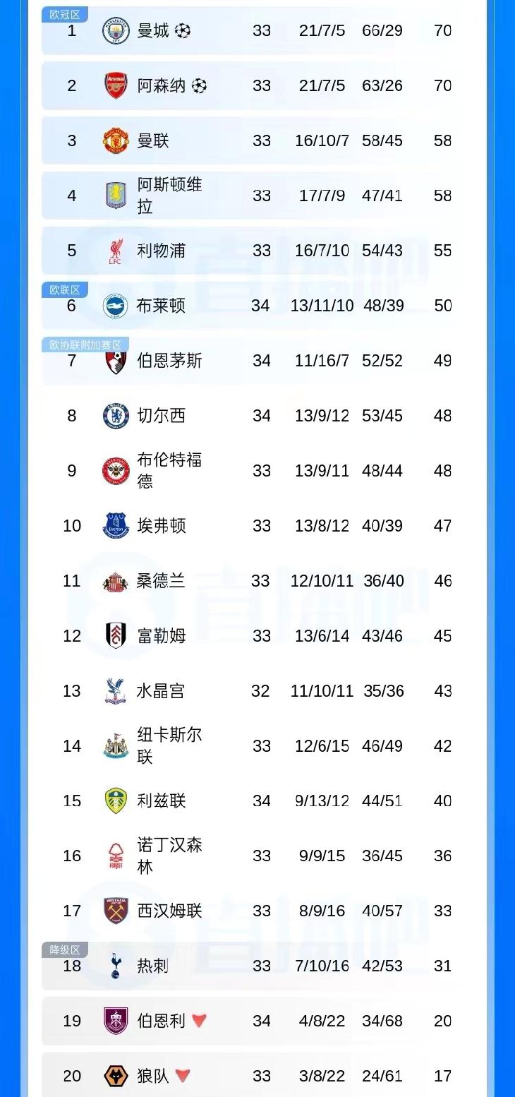 曼城1-0伯恩利,一家欢喜两家忧啊,三支球队的命运被改变了……! 曼城用3场比赛的胜利就彻底逆转了阿森纳的9分优势,如今曼城以3个进球的优势力压阿森纳排名英超联赛第一,也结束了阿森纳长达200多天的榜首位置,曼城夺冠形势一片大好! 半个月前,阿森纳还领先曼城9分,谁能想到半个月后,曼城竟然超越阿森纳排名联赛第一,阿森纳联赛先是主场1-2不敌伯恩茅斯,随后1-2不敌曼城,如今,曼城1-0击败伯恩利,直接占据争冠主动,阿森纳今年会不会又是竹篮打水一场空? 曼城1-0伯恩利,直接宣布伯恩利降级,由于伯恩利与联赛倒数第四的西汉姆联队分差达到13分,而联赛还剩4轮,即便伯恩利全部获胜也才32分,无法超越倒数第四的球队,所以本场比赛的失利,也直接宣布了伯恩利的降级,曼城亲自把对手送去了英冠! 其实接下来的争夺才是真正的进入白热化,曼城和阿森纳净胜球都是37球,只是因为曼城的总进球数比阿森纳多3球才排名联赛榜首,曼城最后的4个对手比阿森纳强,阿森纳还有机会,到底鹿死谁手,就看谁先绷不住谁先犯错了……!曼城 阿森纳