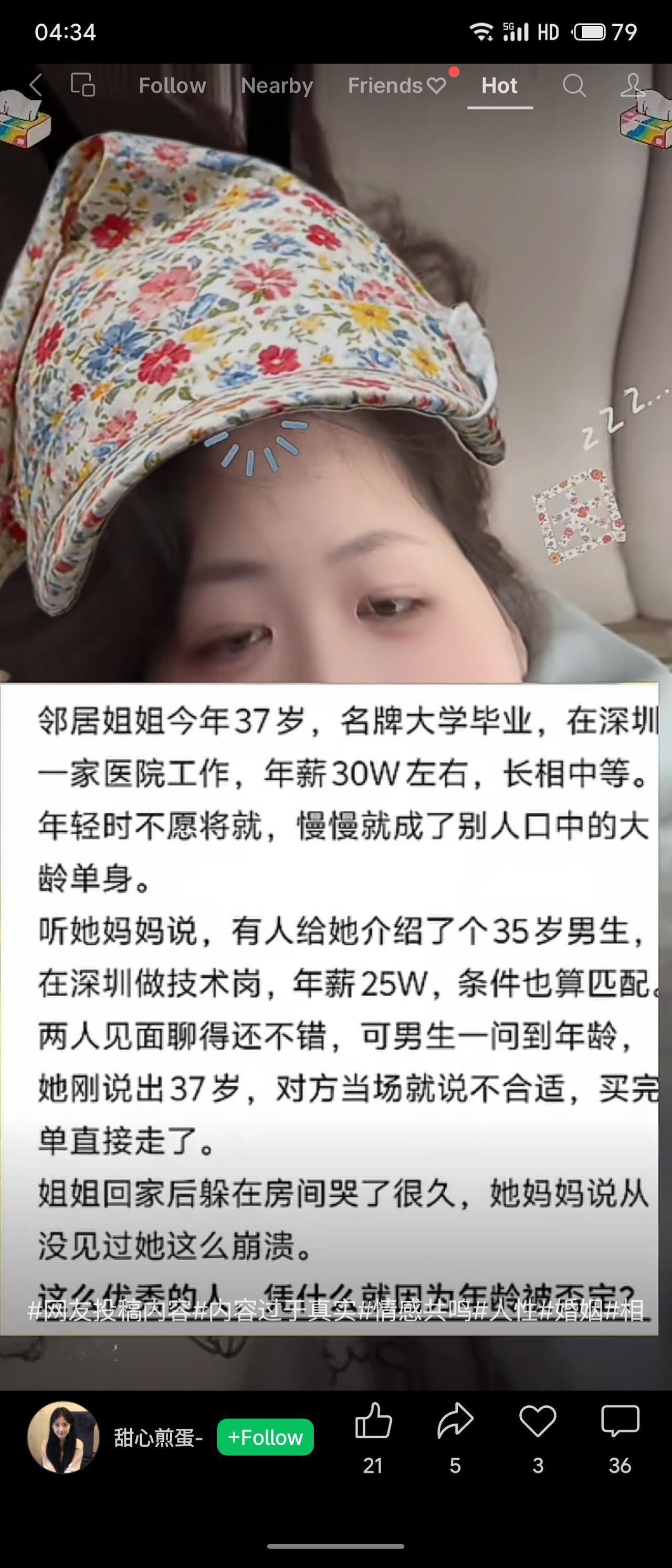 一位37岁名牌毕业、年薪30万的女医生相亲35岁技术男,见面聊得不错,但对方一问年龄,听到“37岁”后当场说不合适,结账走人。女生回家崩溃大哭,从未如此伤心。