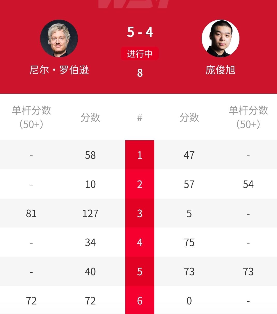 123-0,中国最佳新秀庞俊旭强势发力,3-2、4-5对攻世锦赛冠军罗伯逊!北京时间4月23日凌晨6:10,刚刚结束的2026年斯诺克世锦赛第一轮,中国名将、曾经获得年度最佳新秀庞俊旭,面对80后第一位大满贯得主“墨尔本机器”尼尔-罗伯逊,毫不畏惧,与其展开对攻。比赛第一局,罗伯逊一上来率先发力,1-0领先。第二局,庞俊旭单杆50+,以1-1扳平比分,罗伯逊随后单杆81分,中2-1再次领先。第四局和第五局,庞俊旭又打出单杆50+,他连胜两局以3-2反超比分。之后,罗伯逊再度发力,以5-3再次领先。第九局,庞俊旭轰出单杆122分,4-5追回一局,第一阶段仅以4-5落后。第二阶段还有大把机会。本次世锦赛,庞俊旭通过世锦赛资格赛的争夺,再次来到克鲁斯堡,而这也又一次证明了他的实力。期待庞俊旭在第二阶段有好消息传来!赵心童 丁俊晖