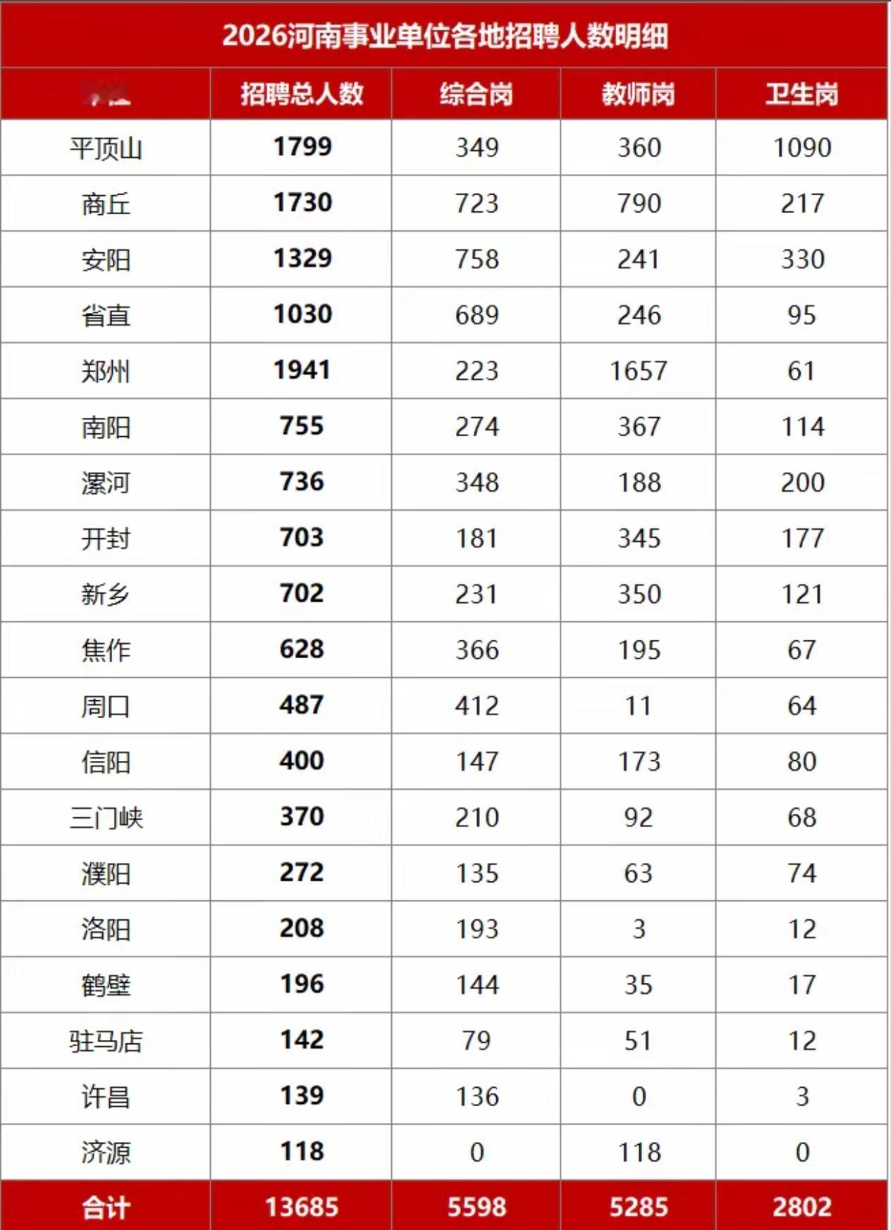 2026河南事业单位联考招录官宣落地✨ 全省放出超1.3万事业编名额,4月24-30日报名,5月30日迎来笔试。 各地招录差距悬殊,郑州招录规模一骑绝尘,平丘、商丘招录体量靠前;豫西、豫南多地岗位锐减,上岸竞争直接加码。 综合、教师、医疗三大岗位全面开招,赛道选择丰富,今年上岸编制的大好机遇已经到来。