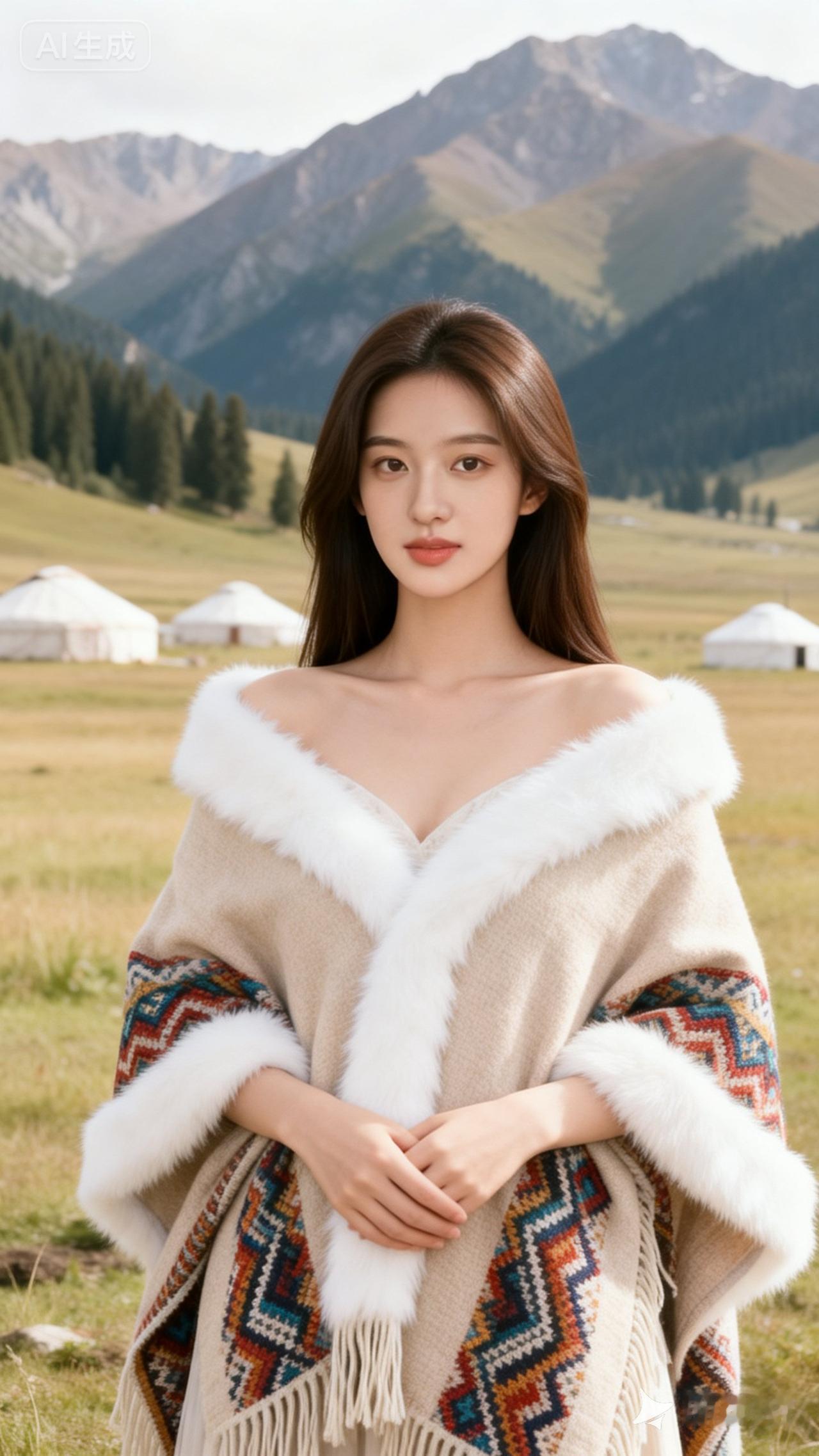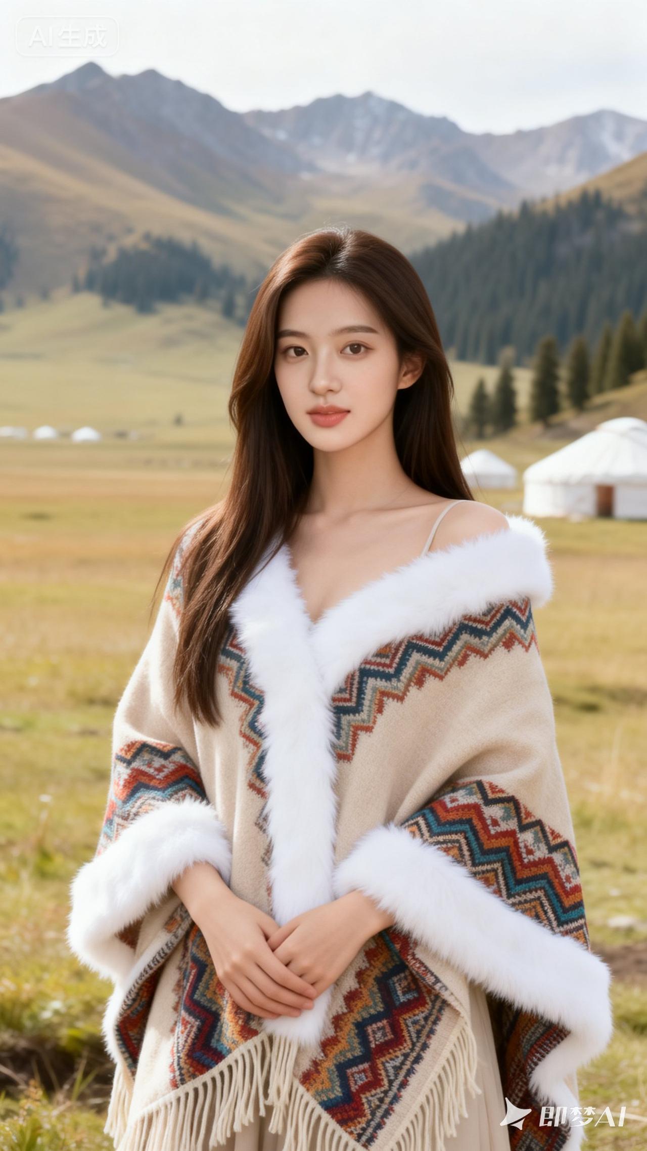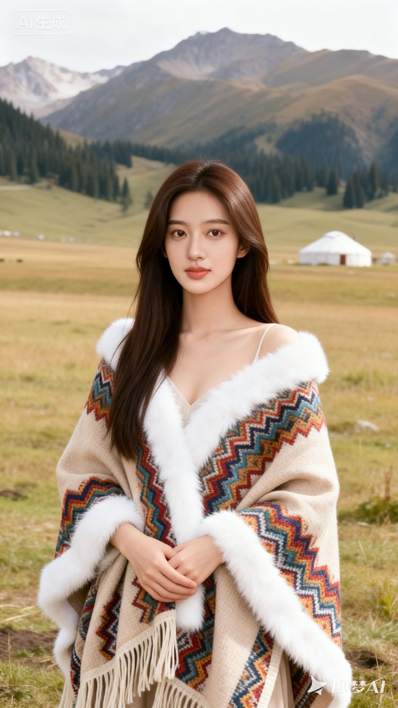 在草原上,感受自由与宁静,穿上毛绒披肩,拥抱自然之美。