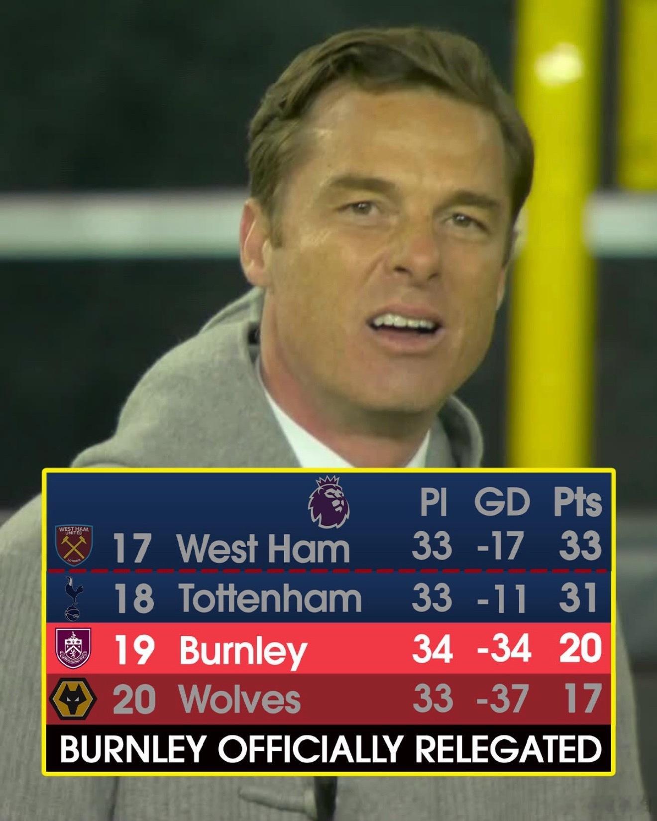 与此同时伯恩利也正式降级!成为本赛季英超第二支提前降级的球队(图六)。排名倒数第三的热刺,是剩余英超球队里现在保级形势最危险的。
