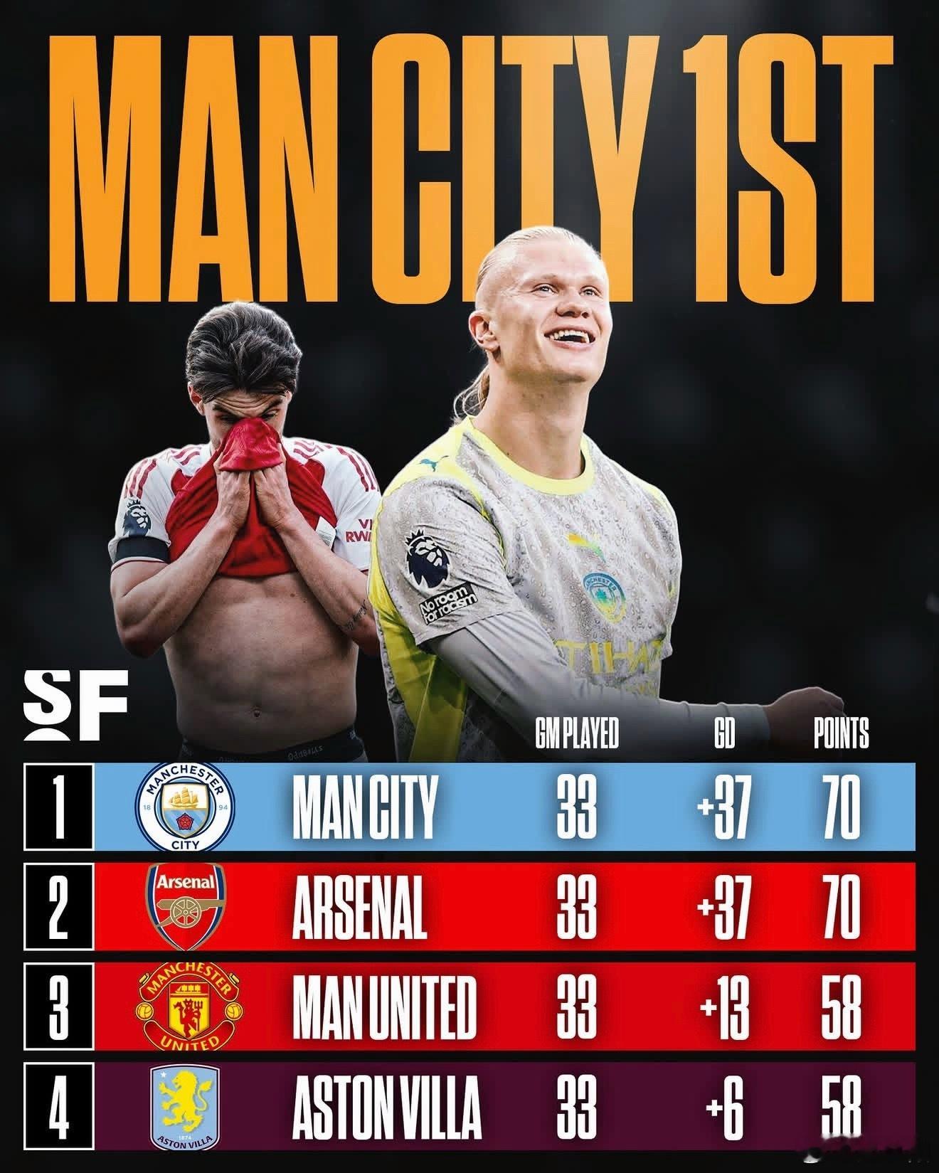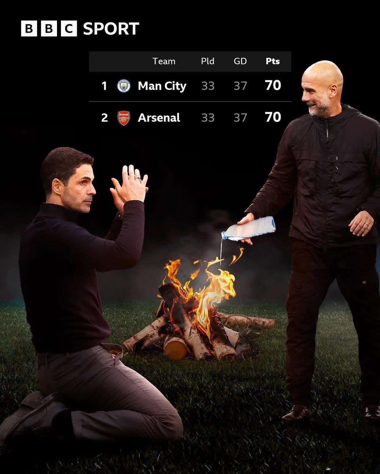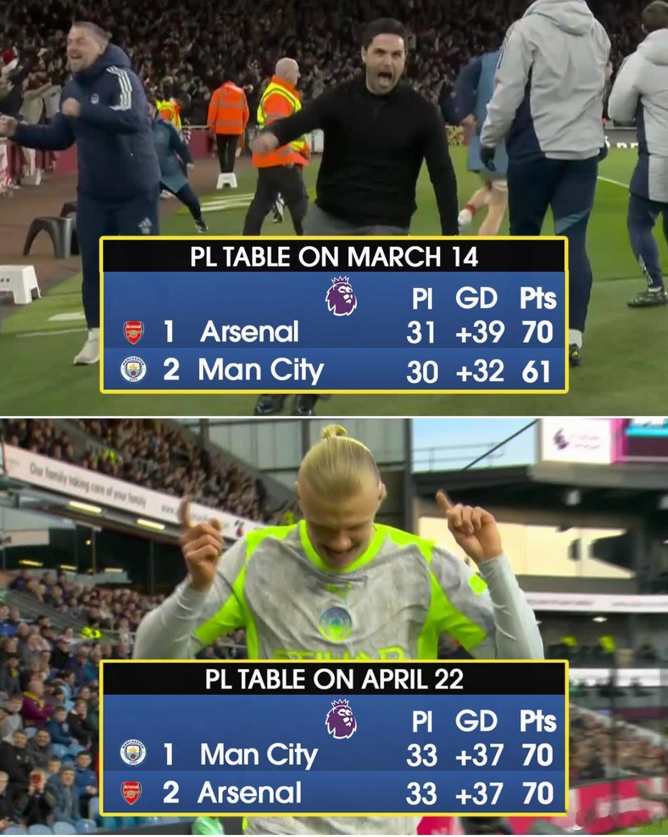 3 月 14 日阿森纳多赛一场还领先 9 分,一个多月后的今天,两队已经平分!