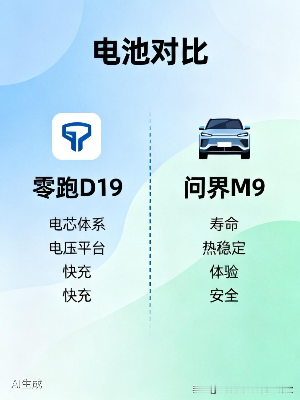 有网友@千里迢迢: 别人怎么说我都不信,映旋老师说的我信,老师最近想换车,零跑D19这个车可以不? 好,我直接给你说说“同是宁德时代电芯,问界M9 vs 零跑D19 到底区别在哪”?对比维度:电芯体系、电压平台、快充、寿命、热稳定、体验、安全。 一、先定调:都是宁德时代,但完全不是同一种电池 问界M9(纯电):100kWh 纯三元锂(高镍)+ 800V 麒麟CTP 3.0 零跑D19(纯电长续航):115kWh 超混电芯(三元+铁锂材料级融合)+ 1000V 高压 二、电芯化学体系(最本质区别) 问界M9:纯高镍三元锂(宁德时代江苏时代) 体系:纯三元锂(NCM/NCA高镍) 能量密度:约 193Wh/kg(整包) 特性:- 电压高、克容量大 允许更大充电电流(高C) 发热更大、析锂风险更高 低温性能好 定位:高端性能、极致快充数据、高续航密度 零跑D19:宁德时代超混电芯(材料级三元+铁锂混合) 体系:三元锂+磷酸铁锂在单电芯内化学融合(不是简单混装) 能量密度:约 210Wh/kg(整包) 特性:- 取铁锂的稳定、低热、长寿命、安全 取三元的高电压、高能量密度、低温不崩 电流上限不如纯三元,但更稳、更耐用 定位:均衡、长寿命、高热稳定、普惠高压 三、高压平台与快充 问界M9 纯电 平台:800V SIC ,峰值功率:≈470kW ,充电倍率:≈4.7C, 电流:≈588A(大电流路线) 时间:30%→80% 15分钟 零跑D19 纯电 平台:1000V 全栈高压 ,峰值功率:≈460kW ,充电倍率:≈4C,电流:≈460A(高压低电流)时间:30%→80% 15分钟 相同时间补能更多一点。电池容量稍大一点。 一句话: M9是800V+大电流+高C堆数据; D19是1000V+低电流+稳C重实用。 四、寿命与循环(用车10年差距) 问界M9(纯三元),循环寿命:≈2500次(到80%容量) 快充影响:频繁高C(4.7C)会加速衰减,BMS策略:偏激进(保速度,牺牲一点寿命) 适合:每年里程少、不常满充满放、换车快 零跑D19(超混电芯) 循环寿命:≈3500–4000次(接近铁锂水平) 快充影响:4C温和快充,衰减慢、发热低 BMS策略:偏保守、温控严(保寿命与稳定) 适合:家用长持、高频快充、跑长途多 五、热稳定性与安全(最关键) 问界M9(纯三元) 热失控温度:≈200–300℃(三元天生低) 发热:大电流快充发热明显更高 安全设计:五层包覆、热失控不蔓延 特点:靠堆热管理+结构安全控风险 零跑D19(超混电芯) 热失控温度:≈500℃+(接近铁锂) 发热:1000V低电流+铁锂特性,发热小很多 安全设计:十层防护、耐1300℃、72小时不起火 特点:材料本身更安全,不靠堆配置保命 六、低温表现(北方用户重点) 问界M9(三元) -7℃容量保持:≈75–80% 低温充电:速度快,但加热功耗高 零跑D19(超混) -7℃容量保持:≈90%(衰减仅10%) 低温充电:双源热泵+超混体系,更稳、掉电少 七、日常体验差异(你能摸到的不同) M9:- 充电峰值更猛、数字更好看 快充时体感更热(尤其夏天) 更贵、定位高端 D19:充电速度一样快,但更稳、更凉,同样时间,补能更多(57.5kWh vs 50kWh) 续航更实、衰减更慢、更耐用,便宜、性价比高 八、一句话总结 问界M9:纯三元+800V+大电流=极致数据、快但娇贵; 零跑D19:超混电芯+1000V+低电流=稳定耐用、快且踏实。 懂了吗? 一个数据亮眼,一个耐用省心,确实不能光看电池品牌选车,还得看自己更看重哪方面。