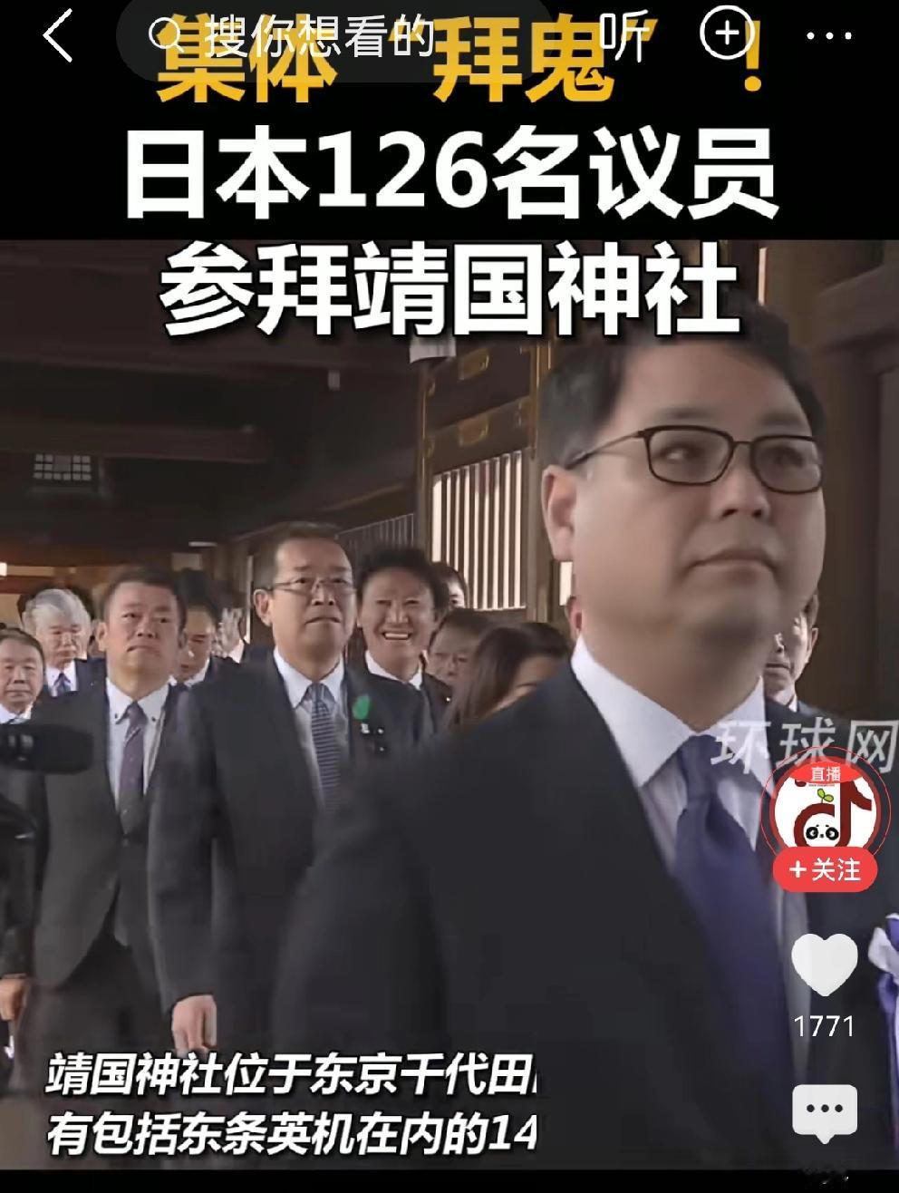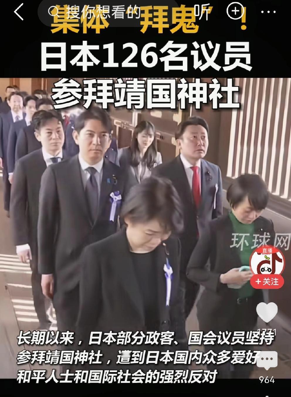奇葩!日本政客集体“拜鬼“ 昨天,高市早苗带领126位日本国会议员参拜靖国神社,集体“拜鬼” 看看这些日本政客,个个脸上阴云密布,身上阴气太重。 这是公开为日本军国主义招魂!也是对日本二战时期对中国,韩国等亚洲人民犯下的罪行的公然否定 日本军国主义死灰复燃,我们中国人必须居安思危,提高警惕,保卫祖国。