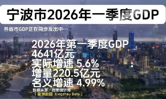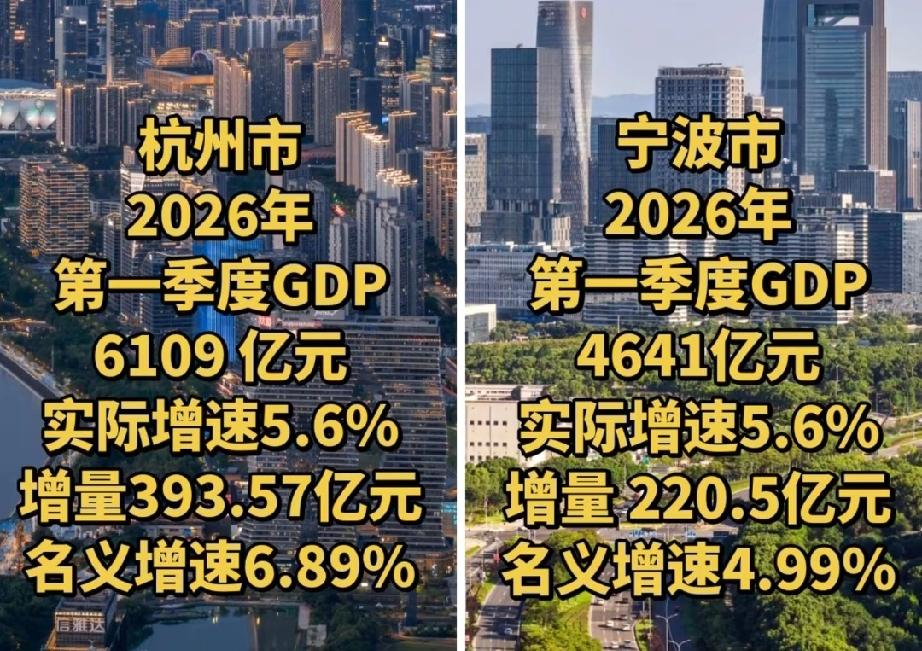 宁波这是怎么了?感觉这样拉下去,今年守住11,都有点费劲! 4月22下午,宁波市统计局公布2026年第一季度GDP数据: 1、经济总量:4641亿。 2、实际增速:5.6%。 3、增 量:220.5亿。 4、名义增速:4.99%。 感觉第一季度的宁波,还未从阵痛中未缓过来,今年想守住第11位有点压力,好在天津也没缓过来,但青岛猛起来,连过两位也是有可能。 而几乎在同时,杭州市统计局也公布了2026年第一季度GDP,数据着实亮眼,简直夯爆了: 1、经济总量:6109亿元。 2、实际增速:5.6% 。 3、增 量:393.57亿元。 4、名义增速:6.89%。 宁波似乎被老大哥甩下了,杭州有点扬长而去的感觉,省内的金华、绍兴等也会很给力。 浙江省,今年经济有两个看点: 1、全省GDP是否能突破十万亿,去年总量为94545亿元。 2、宁波市继超越无锡、青岛、天津后,今年能否反超南京,一举闯入全国经济10强。 目前看来,浙江省GDP超十万亿,几乎没有任何悬念。 但宁波今年想反超南京,可能性在逐渐减小,11的位置似乎要待上几年,稍不留神,青岛甚至无锡都会逆袭。
