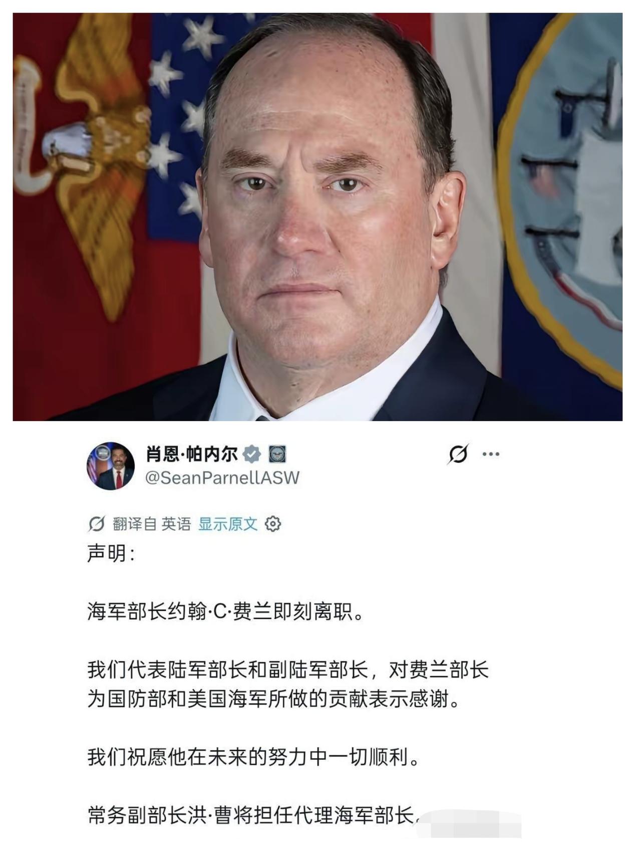 美国海军部长费伦突然辞职走人,临阵换帅笑死人! 封锁霍尔木兹海峡的紧要关头,美国海军部长费伦突然辞职走人,堪称国际政坛大型翻车现场。这位毫无军旅履历的商人高官,本就是特朗普靠政治献金上位的亲信,堪称典型的政治酬庸产物。 费伦上台本就不是凭专业能力,全靠为竞选募资换来高官厚禄。如今美军要封锁海峡、对伊施压,这位外行领导既镇不住军方高层,又完不成白宫的强硬部署,力有不逮只能仓皇跑路。 前脚刚启动海上封锁,后脚海军掌门直接撂挑子,美军高层内斗与用人腐败暴露无遗。从陆军参谋长到海军部长接连离职,白宫任人唯亲、军工复合体争权夺利,把军国大事当成政治分赃游戏。 关键时刻临阵换帅,尽显美军内部混乱不堪。靠金主亲信执掌海军,面对波斯湾紧张局势只会一塌糊涂。这场闹剧也让世界看清:美国所谓海上霸权,早已被政治交易与外行指挥掏空根基。 美军将领辞职