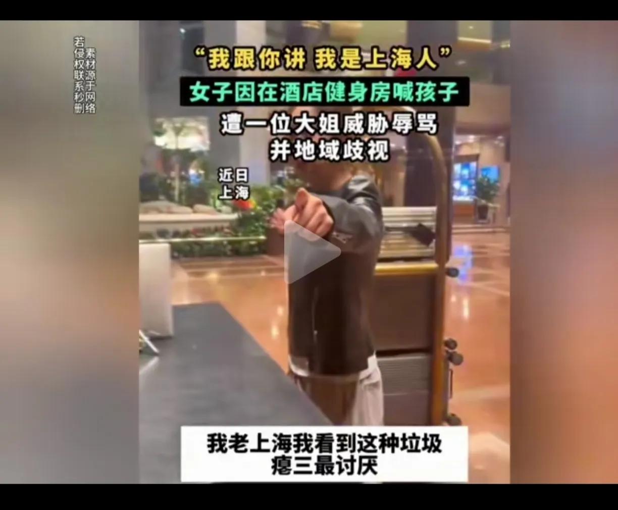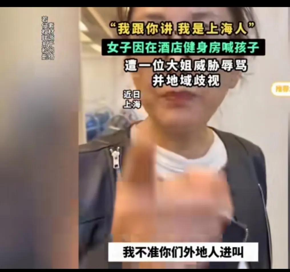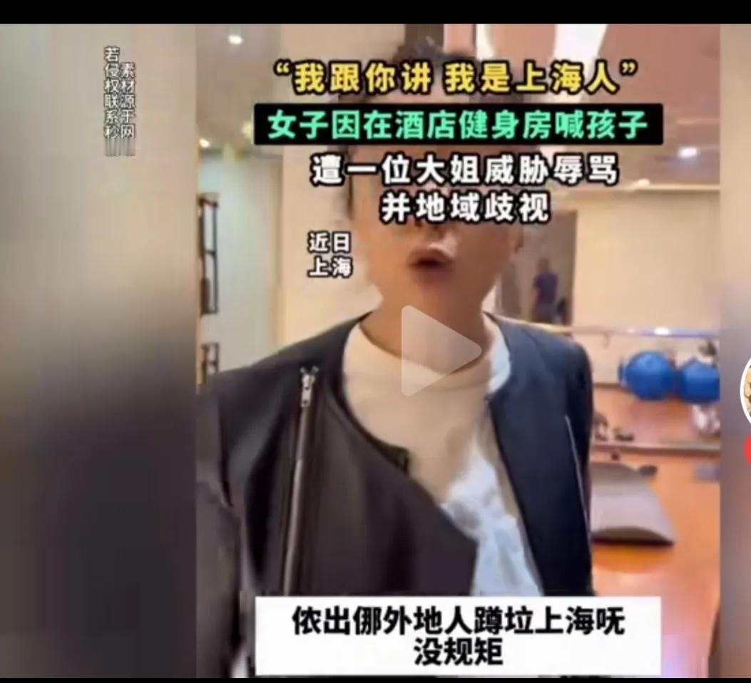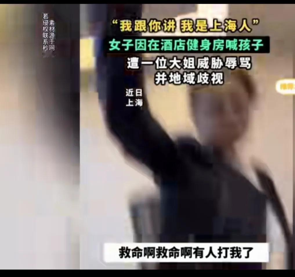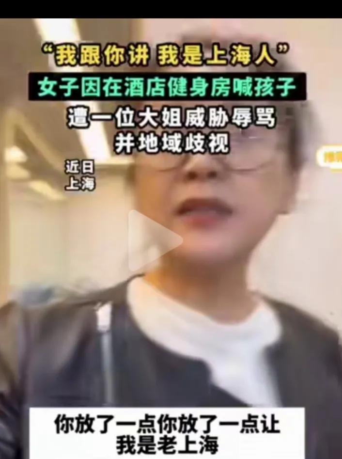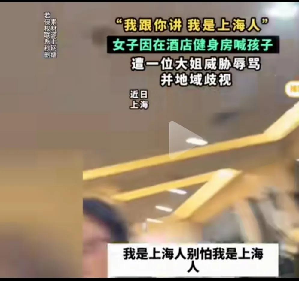 这位戴眼镜的大姐,左一声右一声的自称是上海人,是老上海人,用言语侮辱歧视外地人,把个人冲突,升级到对外地人的层面上。 女子在健身房喊孩子,被一个大姐辱骂,说女子是外地人在上海不懂规矩,不准外地人在那里叫,影响她健身,还一直强调说她是老上海,女子辩解,说自己跑步叫自己的小孩有什么错。 争吵中还引起肢体冲突,大姐动手拉扯女子,旁边人劝阻,大姐还说,别怕我是上海人。
