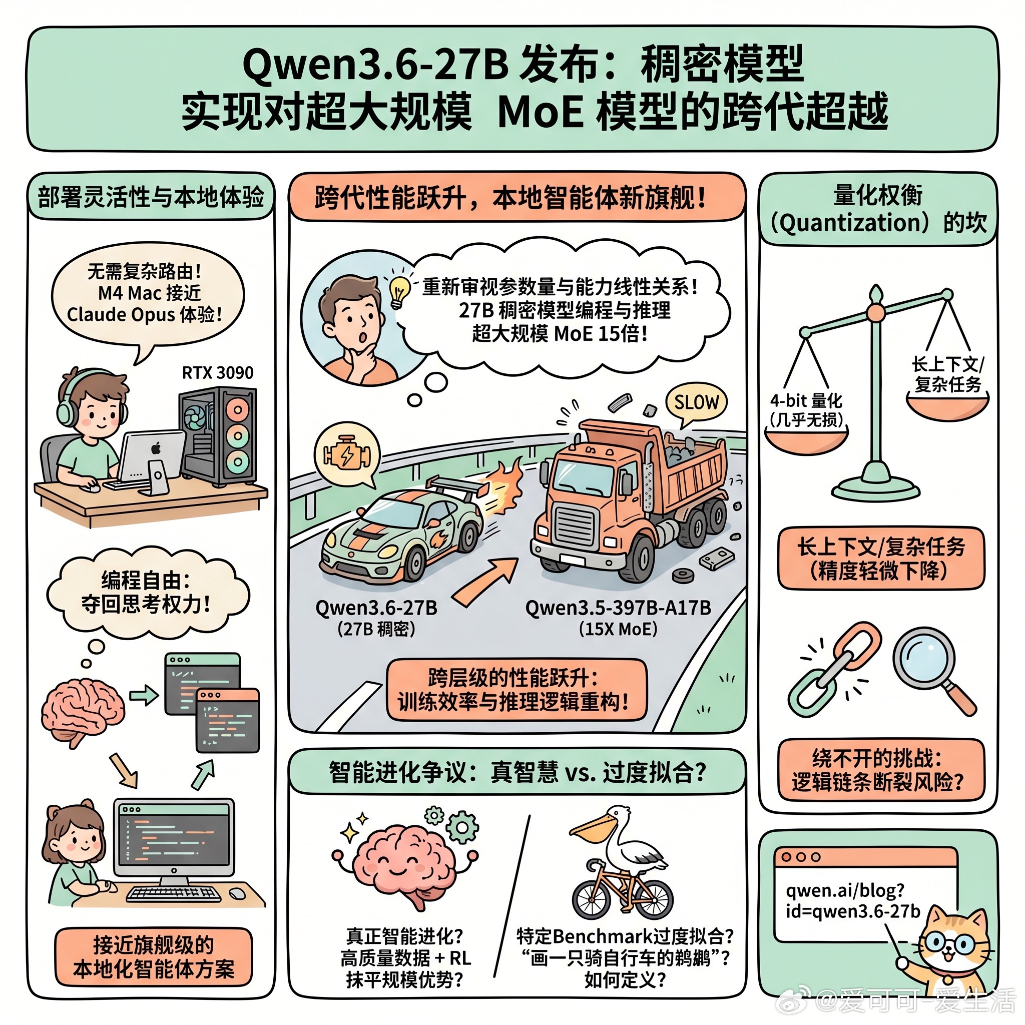 快速阅读:Qwen3.6-27B 的发布标志着稠密模型在编程与推理任务上实现了对超大规模 MoE 模型的跨代超越。其在保持极高部署灵活性的同时,为开发者提供了一个接近旗舰级的本地化智能体方案。