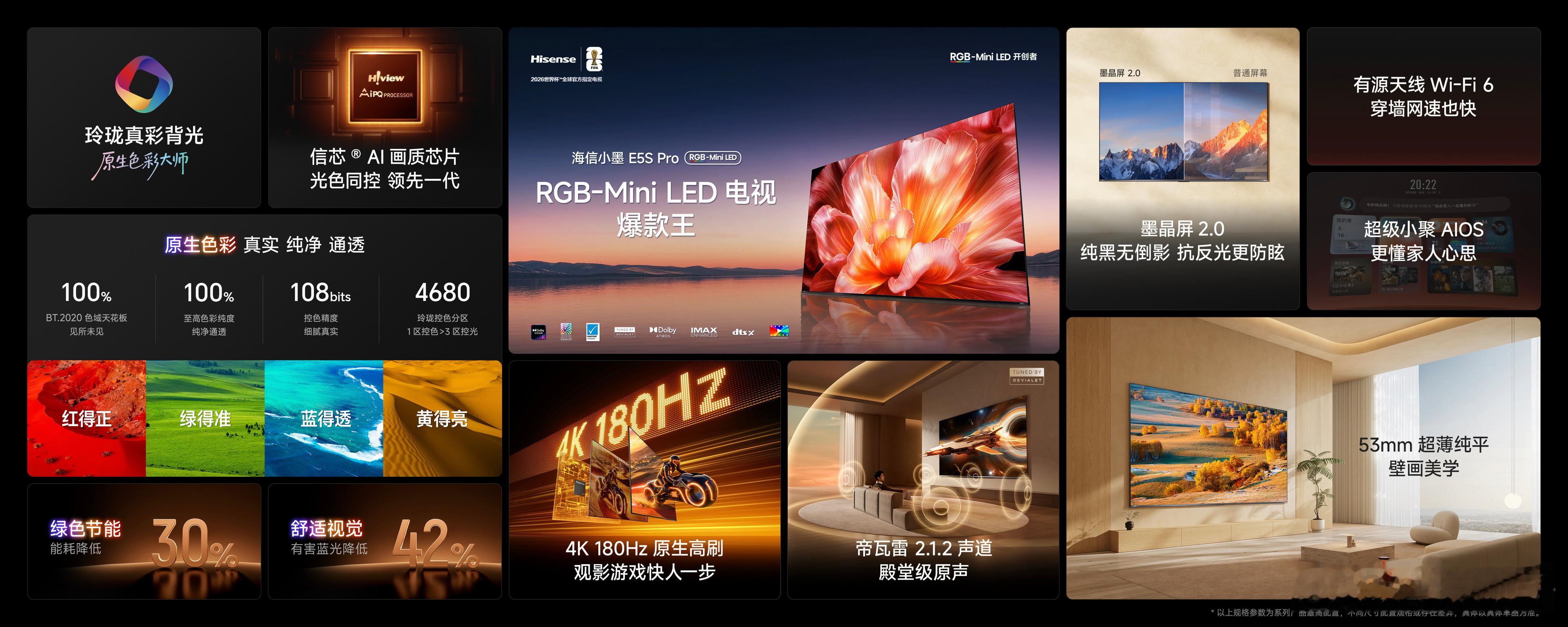 两款新品精准解决家用电视核心痛点,实现全方位硬件升级。高配的E5S Pro搭载主流优质的RGB-Mini LED背光技术,搭配海信自研信芯AI画质芯片,精准把控画面光影细节,控光更精细、色彩更纯粹,复刻影视原片质感。标准版小墨E5S重磅升级墨晶屏2.0,大幅优化屏幕抗眩光、抗反光性能,即便白天强光直射客厅,画面依旧通透清晰,告别泛白、倒影困扰。