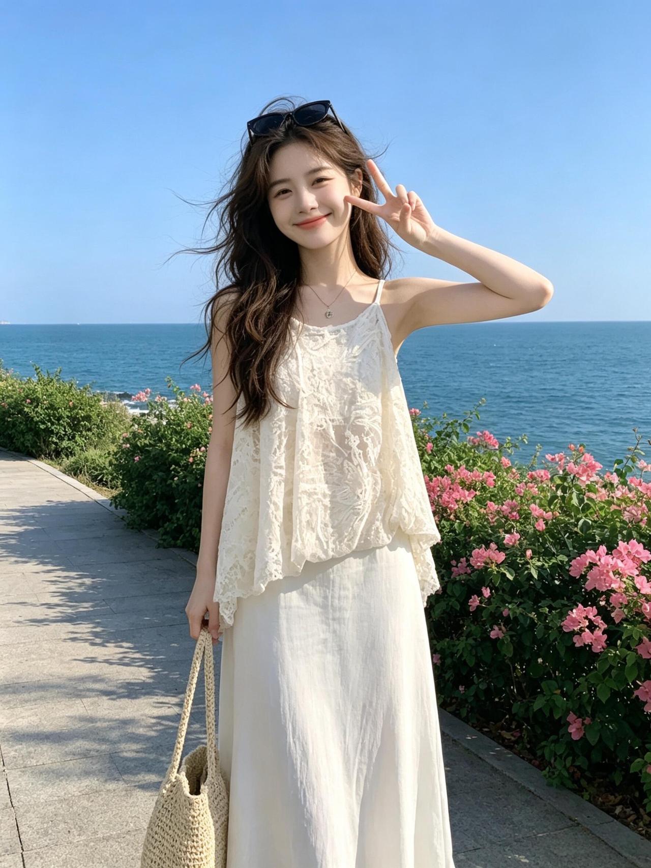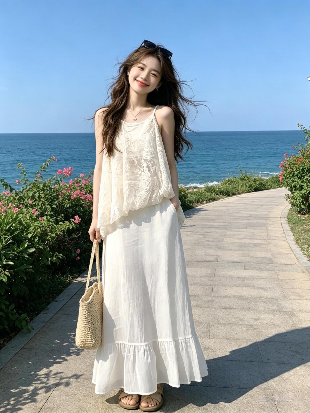 夏日清新穿搭草帽+白色连衣裙轻松自在