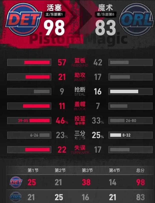 39分输球,27分赢球。坎宁安数据越差,活塞越强。邪门不? G1全网喷他独狼,23岁状元空砍39分,带队能力为零。才隔两天,G2 27分11助攻,哈里斯16+11,杜伦11+9,汤普森11+8,罗宾逊10分,斯图尔特10分,6人上双。比克斯塔夫46岁,看明白了:坎宁安不是炸药包,是发动机。G1一人抡,输11分;G2让全队抡,赢15分。 魔术更逗。G1以下克上,全网喊黑八。G2第三节,半节被活塞打30-3,单节16-38,直接断电。莫斯利46岁,暂停喊冒烟,球员眼神涣散。班凯罗23岁18分,萨格斯24岁19分,数据好看,贝恩12分,瓦格纳12分,卡特3分。G1五虎全上双,G2双核带不动。 比克斯塔夫调整狠在哪?G1让魔术内线轰54分,G2禁区变禁飞区。杜伦、斯图尔特、格林轮流送火锅,首节7封盖,1996年以来季后赛之最。坎宁安不再往里扎,11次助攻撕烂防线。G1被踩泥里,G2带队爬起来。这骨相,才是状元该有的。 莫斯利该醒醒了。魔术天赋够,班凯罗、萨格斯、瓦格纳都年轻,但天赋不等于赢球。第三节崩成那样,不是实力,是心态。季后赛比谁先犯怵。活塞G1输了,G2首节7封盖立威。魔术G1赢了,G2第三节直接投降。 坎宁安和班凯罗,都是23岁。一个从泥里爬出来,一个被按回泥里。季后赛这堂课,学费很贵。活塞胜魔术总分扳成1-1