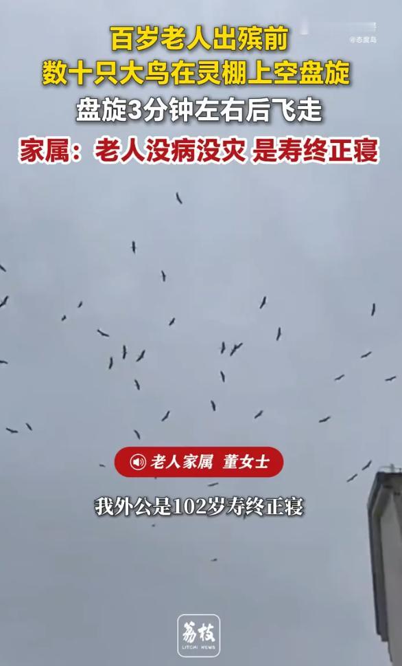 “科学都解释不清了!”江苏徐州一个普通村落里,送葬队伍正准备抬起灵柩的那一刻,天空突然暗了下来。数十只体型硕大的灰羽大鸟毫无征兆地飞到灵棚正上方,排成密集阵型,一圈圈盘旋不止,还发出低沉拖长的哀鸣声,像是在为谁哭泣。 整个院子瞬间安静,所有人抬起头,眼睛死死盯着头顶。这诡异的一幕整整持续了三分钟,直到灵柩被稳稳抬起,鸟群才突然收翅,扑棱着飞向远方,消失得干干净净。 躺在灵柩里的,是村里一位活到102岁的老人。四月份的徐州,天气刚转暖,他走得非常平静,没有任何病痛折磨,就在自家床上安详地闭上了眼睛。 村里人都说这是难得的寿终正寝。出殡定在老人离世第三天,天还没大亮,院子里已经挤满了帮忙的乡邻。 大家搭灵棚、摆祭品、招呼来人,动作都放得很轻,说话声音压得低低的,生怕惊扰了老人最后的安宁。哀乐声在院子上空轻轻飘着,一切都显得格外肃穆。 鸟群突然出现,让整个葬礼现场的人都愣住了。乡邻们互相交换眼神,心里翻起阵阵波澜,老人这一辈子,从没跟人红过脸。村东头谁家孩子上学交不起学费,他总是悄悄把钱塞过去,从不声张。 村西头有个孤寡老人没人照顾,他每天挑水、送饭,一做就是很多年,哪怕是路上遇见流浪的猫狗,他也会停下来,拿吃的喂它们。村里人提起他,没有一个不竖大拇指,都说这是个真正的好人。 鸟群飞走后,送葬队伍继续向前,但大家心里都藏着同一个疑问:为什么偏偏在这位老人的葬礼上,出现这么奇怪的事?有人从科学角度分析,徐州地处候鸟迁徙路线,四月正是鸟群北飞的季节,灵棚附近可能有食物气味,或者搭建的灵棚改变了局部气流,吸引鸟群盘旋。 可村里大多数人根本不接受这种解释。他们坚定地认为,这是老人一辈子行善积德,老天爷派鸟儿来给他送行,那些低沉的哀鸣,就是对老人善良一生的回应。 在乡亲们朴素的心里,好人就该有好报,哪怕只是这样一场说不清道不明的“天意”,老人活了102年,没做过一件亏心事,走得安稳,走后还这么特别。大家宁愿相信鸟群是有灵性的,宁愿把这三分钟看成上天对善良的最高致敬。 这种执念,其实是老百姓对真正好人最真挚的保护和认可,它让人在冷冰冰的现实里,还能感受到一丝温暖的人情味。 老人用平凡的一生证明,默默帮助别人,不争不抢,虽然换不来大富大贵,却能换来内心的踏实和走后的尊重。那群大鸟的出现,为他漫长却干净的一生,画上了一个特别的句号。 你觉得天上飞来的那群鸟,到底是自然界的巧合,还是对善良最直接的回应?欢迎在评论区说说你的看法。 信源——荔枝新闻