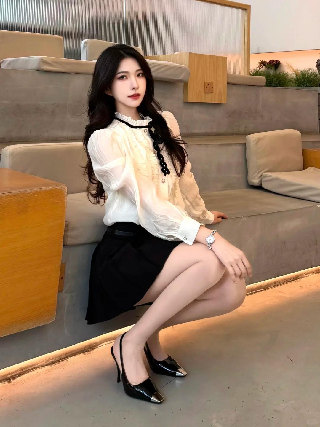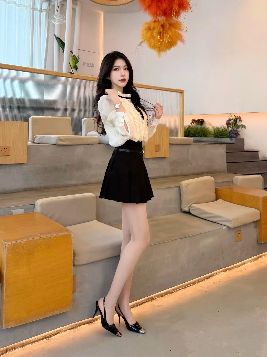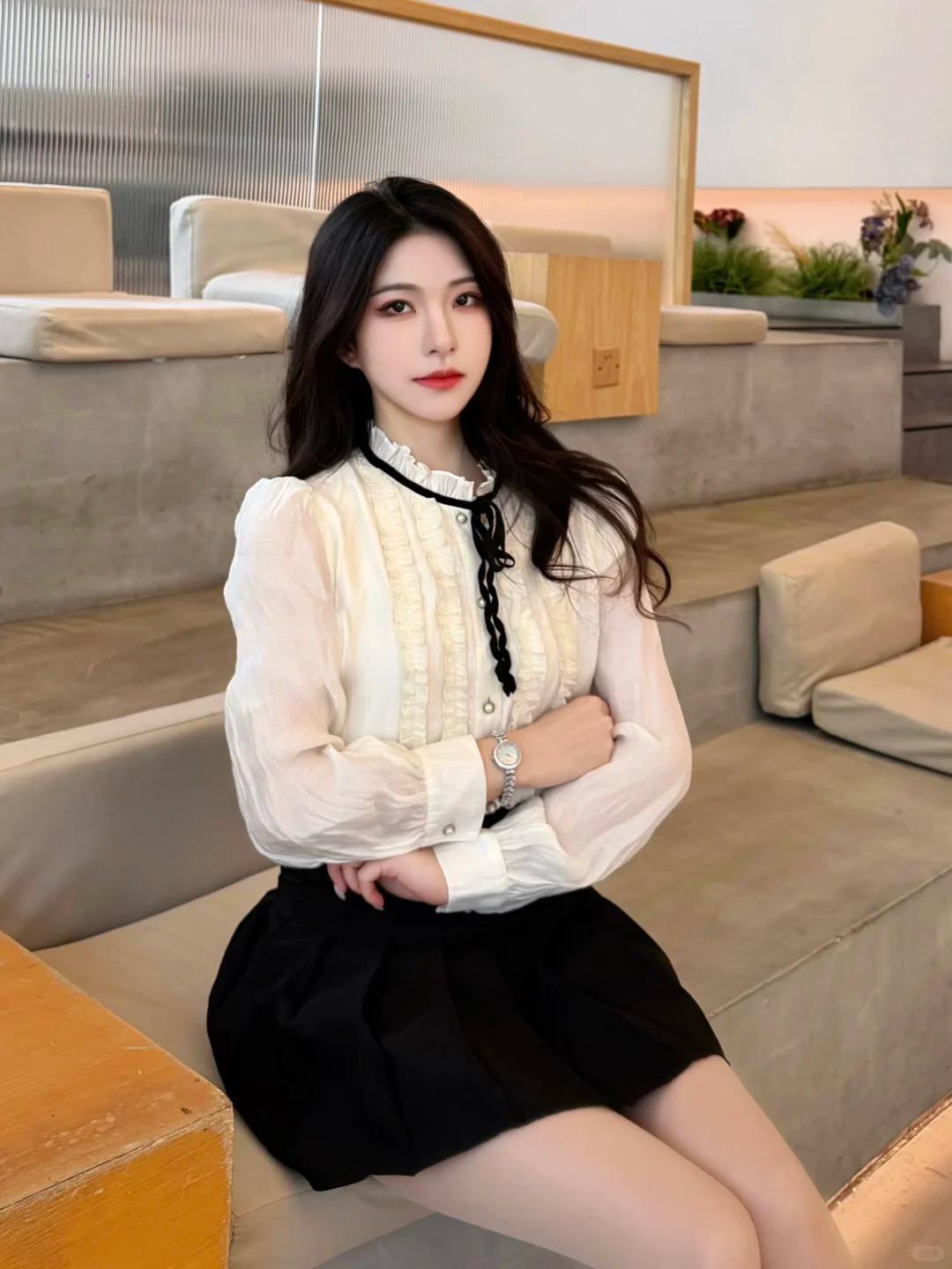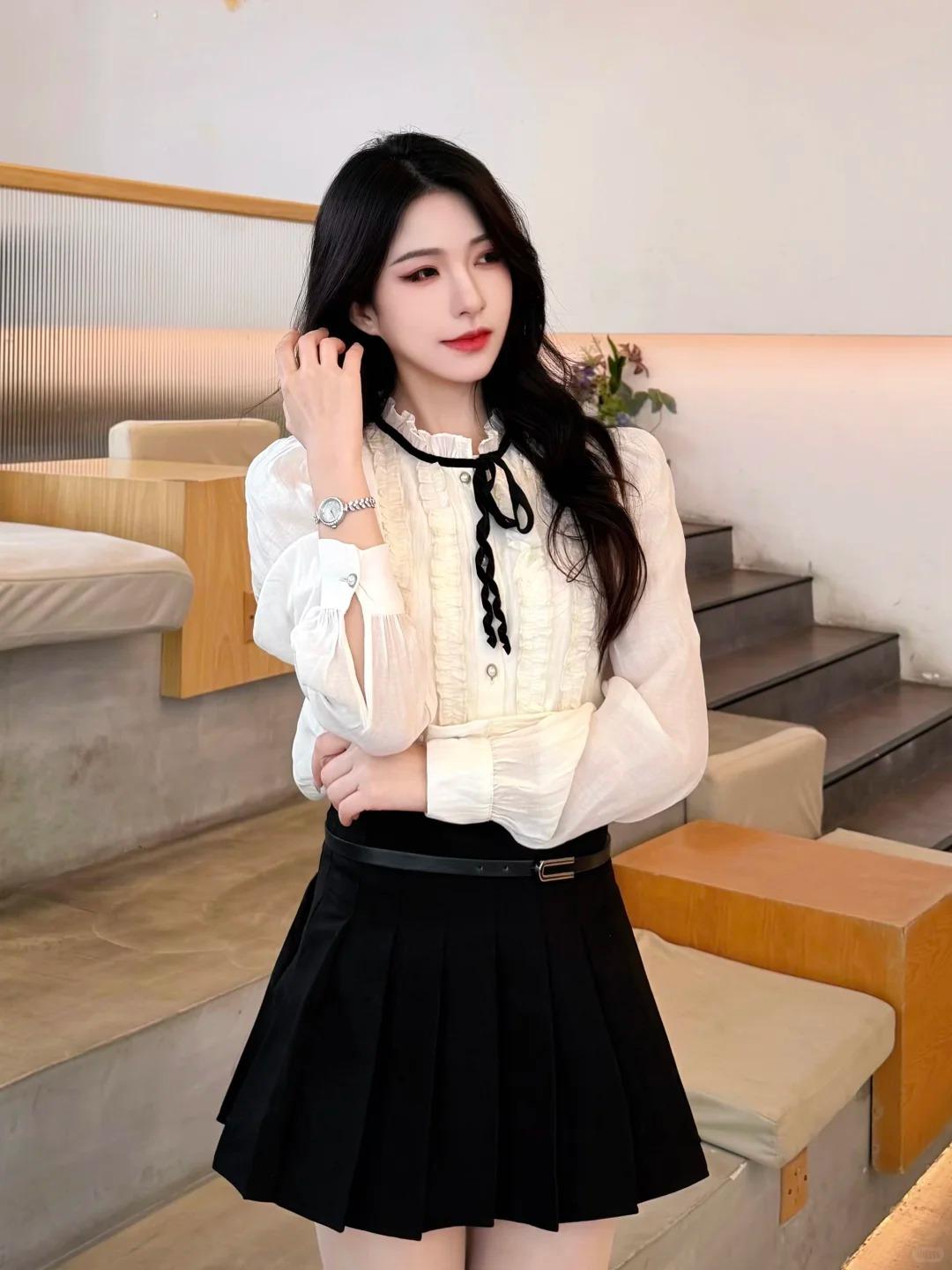 今天是自带温柔贵气感的千金风~ 米白色木耳边衬衫配黑百褶裙,领口黑丝带和袖口珍珠扣细节拉满,搭个小手表和尖头高跟,精致又不刻意。 咖啡馆暖光下氛围感直接拉满,不管是和朋友下午茶还是约会穿都很合适,舒服又显气质。