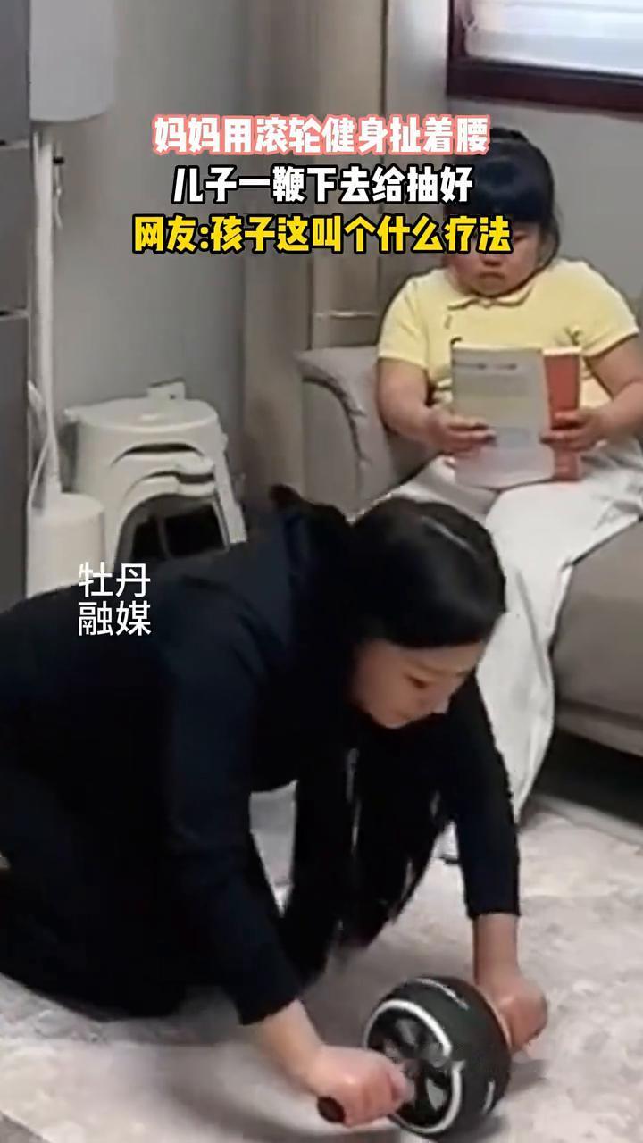 妈妈用滚轮健身扯着腰,儿子一鞭下去给抽好。网友:孩子这叫个什么疗法? 牡丹融媒。 来源:我叫小米儿。