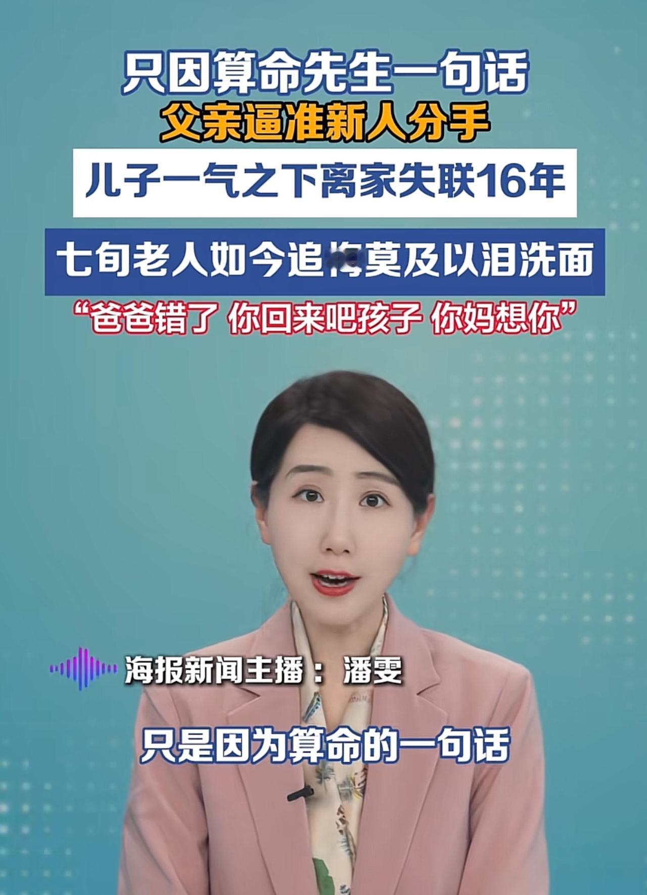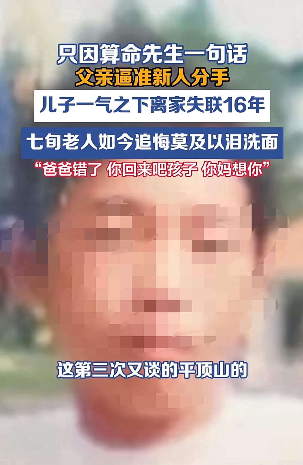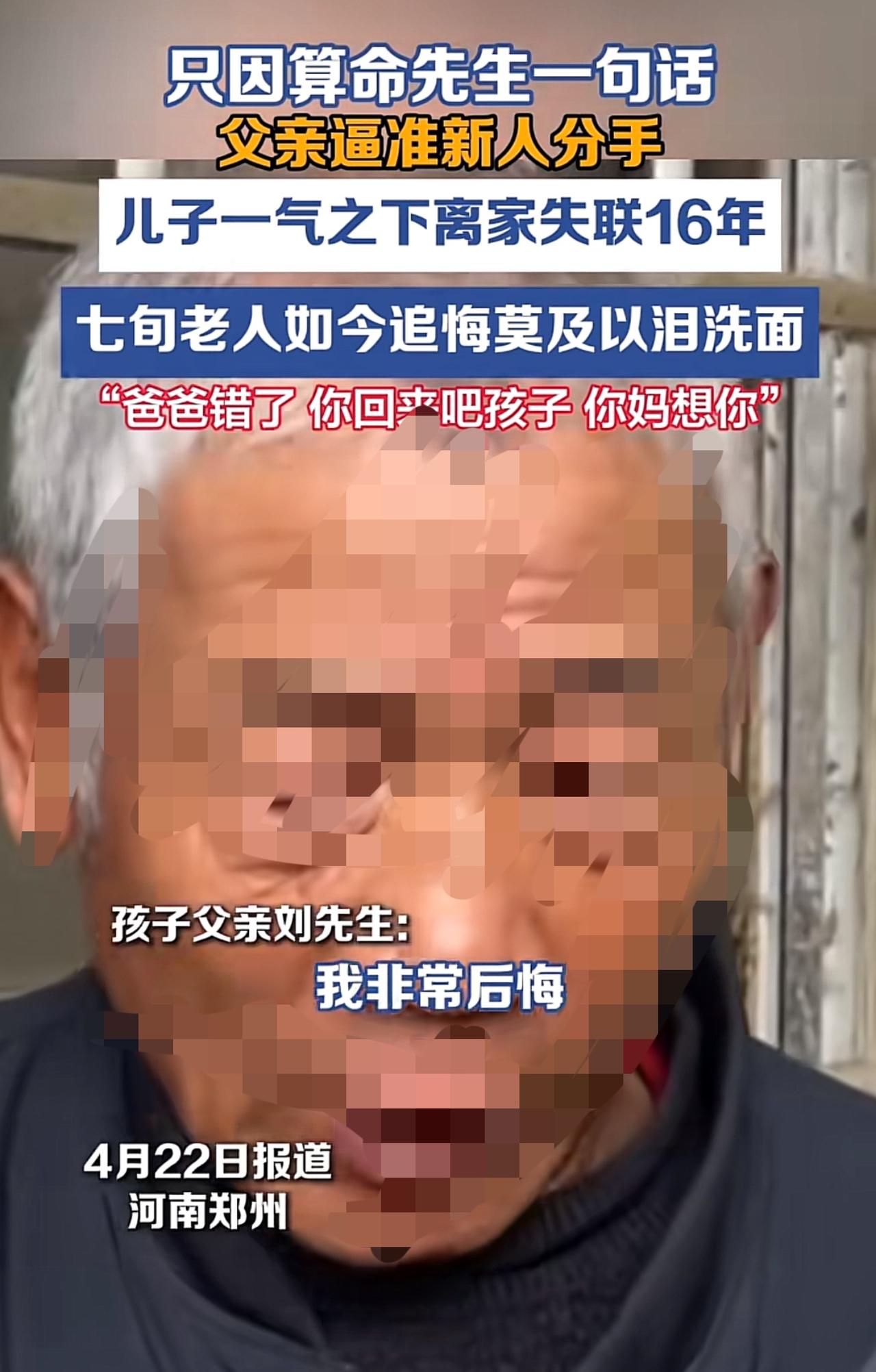 只因算命先生一句“属马不宜找西南方向的,婚姻不长久”,七旬的刘大爷,亲手把即将谈婚论嫁的儿子逼走了。 儿子在郑州,女友来自平顶山,这段被父亲算成“不吉”的感情,成了压垮骆驼的最后一根稻草。这已经是父亲第三次干涉他的恋情。 第一次:嫌女方是陕西人,家太远,逼分手。 第二次:嫌女方长得不好看、配不上,亲自上门搅黄。 第三次:儿子与平顶山女友谈婚论嫁,算命说"属马不娶西南女",刘大爷以死相逼。此前两次分手,早已耗尽了他的耐心。这一次,他没有再妥协,一怒之下离家出走,断了所有联系,这一走,就是整整16年。 16年里,父母的思念成了眼泪和悔恨,如今面对镜头,老人哭着说:“爸爸错了,你回来吧孩子,你妈想你。”可这份迟来的道歉,不知还能不能等到儿子的回应。 这件事提醒我们即将面对儿女婚姻的中年人。一定不要过多的干涉儿女的婚事,可以建议,但不强制。硬掰断一段婚姻,如果孩子将来过得不好,她心里最怨恨的就是父母。孩子的日子自己过,甜也罢,苦也罢,都是孩子该经历的。自己选择的也不会有怨言。 再说了,做父母选的就一定对吗?更何况听算卦的更不可取。