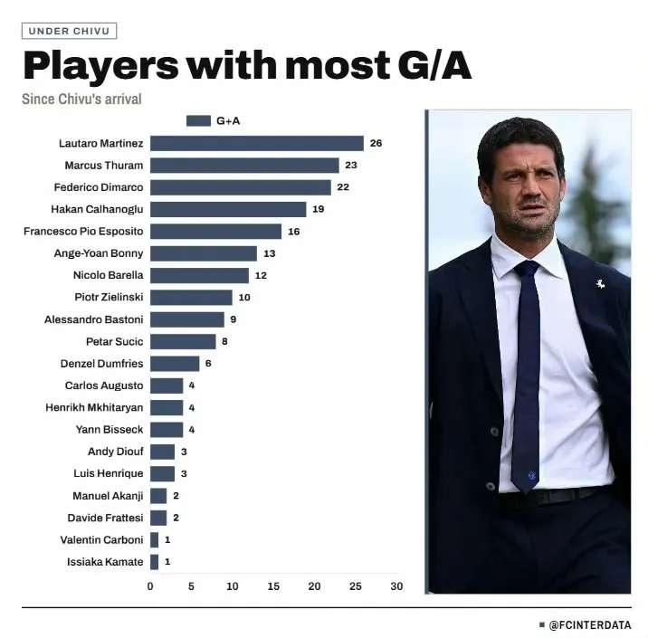 这张图列举了齐沃执教期间,进球和助攻的数据榜单。显而易见,前锋可比上赛季表现好太多了,皮奥排名都这么靠前?本以为慢工出细活,结果这赛季火箭一般蹿升;弗拉太西是真的尴尬,赶紧找个下家走吧,别互相耽误了;这赛季进攻的主要支点依然是劳塔罗,有没有塔罗在,球队完全两个样儿,但是数据上是多点开花;博尼也还凑合,但是这赛季高开低走了,得想办法帮他找回状态。总的说,好消息是前锋作用明显,中场贡献也不小,坏消息是泰西真的很难卖出去了。