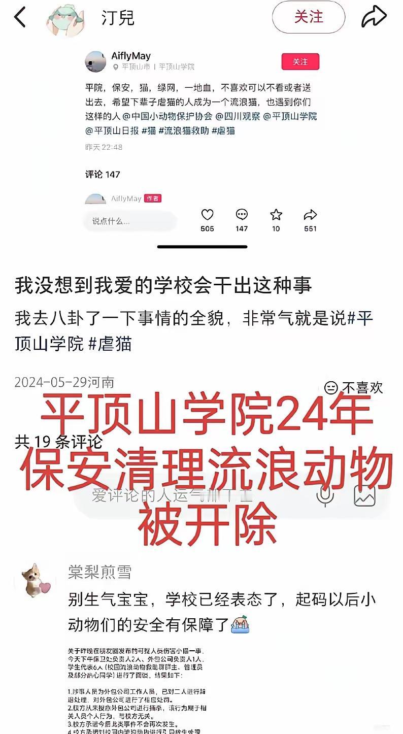 河南平顶山学院的师生傻眼了吧,去年要开除保安那会儿都还是可爱的猫猫狗狗,怎么现在就成了恶狗了呢? 前后如此反差,有失体统,斯文扫地啊! 也不知道那被开除的保安现在过的如何,当他知道这个事情的时候,多少也能得到些许抚慰吧!